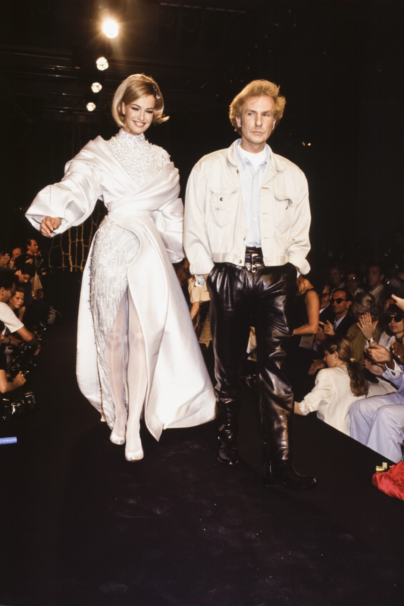 Karen Mulder et le couturier Claude Montana au défilé Lanvin, Haute Couture, collection Automne-Hiver 1991-92 à Paris en juillet 1991, France. (Photo by PAT/ARNAL/Gamma-Rapho via Getty Images)