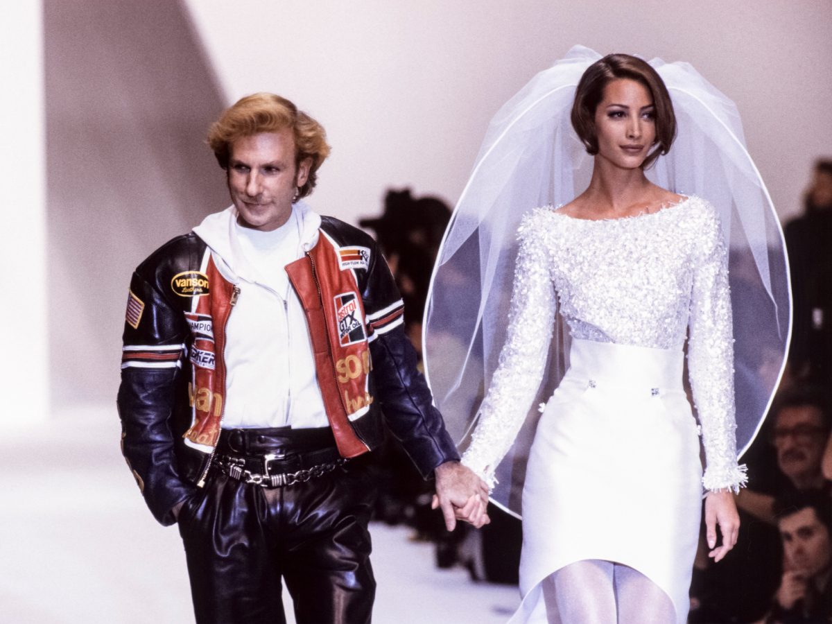 Karen Mulder et le couturier Claude Montana au défilé Lanvin, Haute Couture, collection Automne-Hiver 1991-92 à Paris en juillet 1991, France. (Photo by PAT/ARNAL/Gamma-Rapho via Getty Images)
