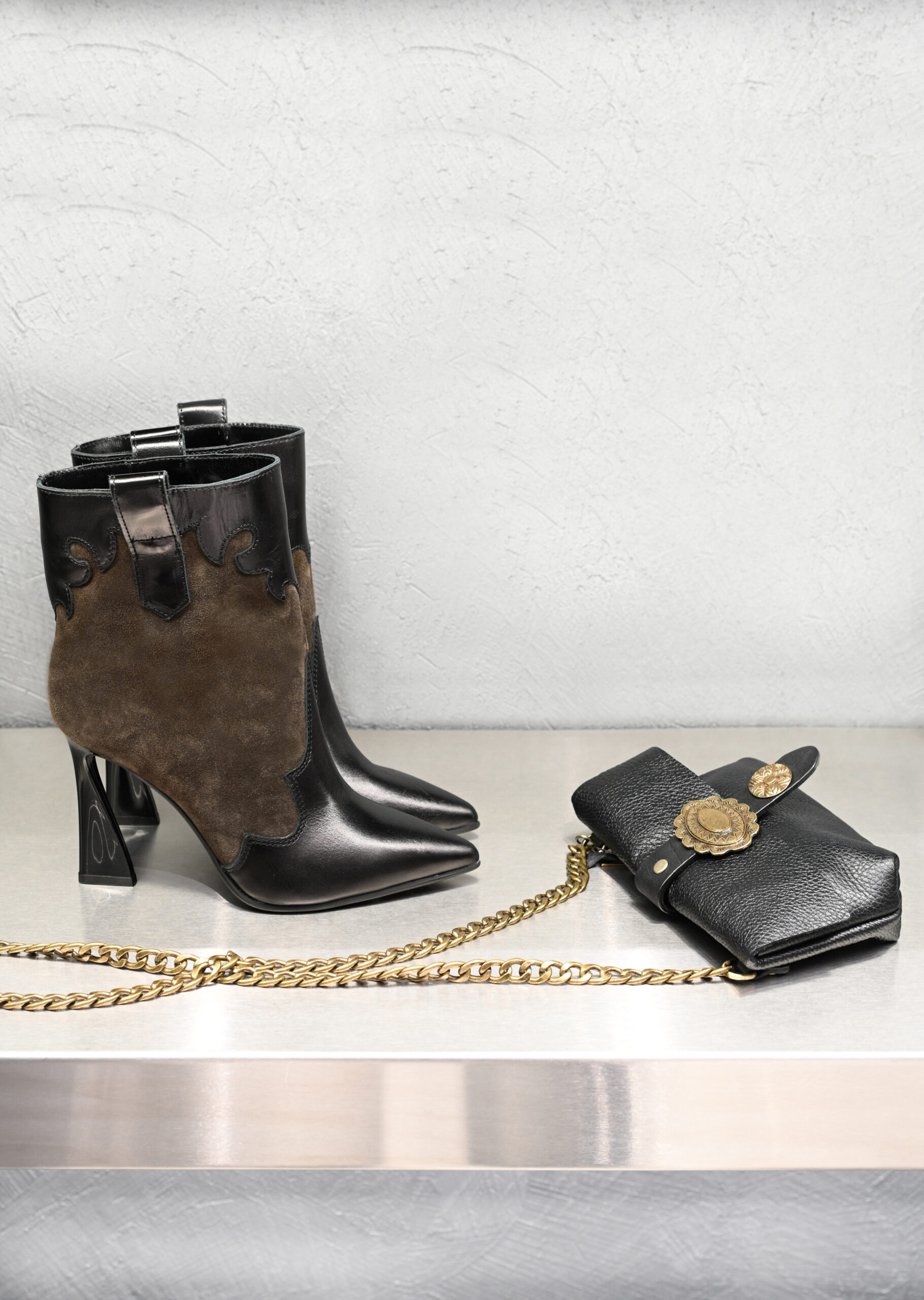 Τα western booties συνεχίζουν δυναμικά. Στα Tsakiris Mallas ξεχωρίσαμε ένα δίχρωμο σχέδιο σε μαύρο δέρμα και καφέ καστόρι. Φοριούνται από το πρωί μέχρι το βράδυ και δίνουν χαρακτήρα σε κάθε outfit. Ένα ζευγάρι που δεν περιορίζεται σε εποχές και περιστάσεις.