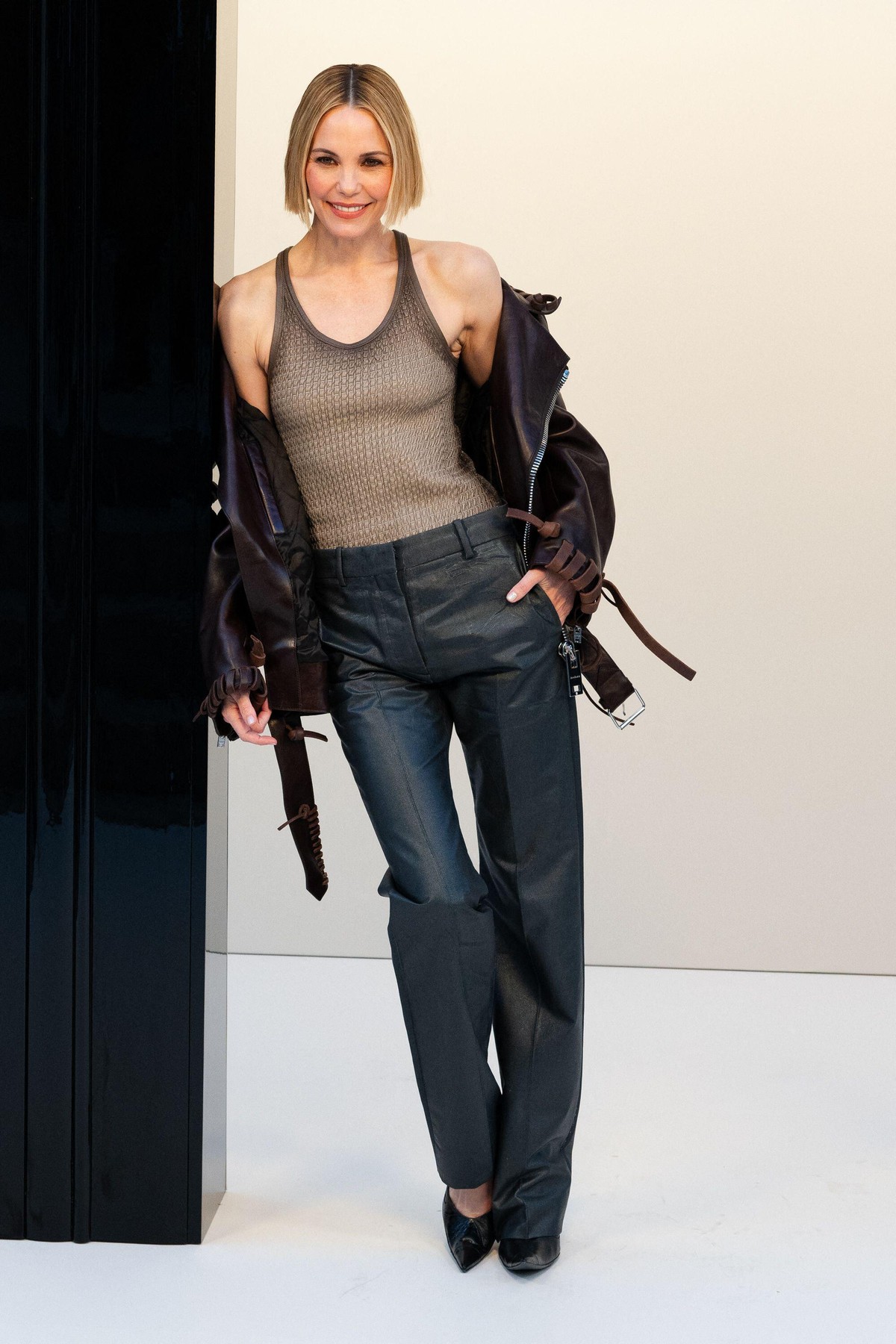 Με tank top και bomber leather jacket, η Leslie Bibb έδωσε στο κλασικό παντελόνι της έναν πιο μοντέρνο και fashion-forward χαρακτήρα.