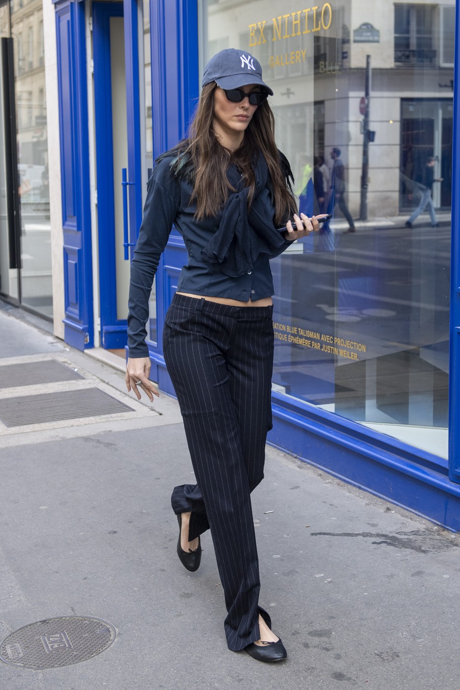 City vibes έδωσε η Vittoria Ceretti, συνδυάζοντας pinstripe παντελόνι με jean πουκάμισο, baseball hat και μπαλαρίνες.
