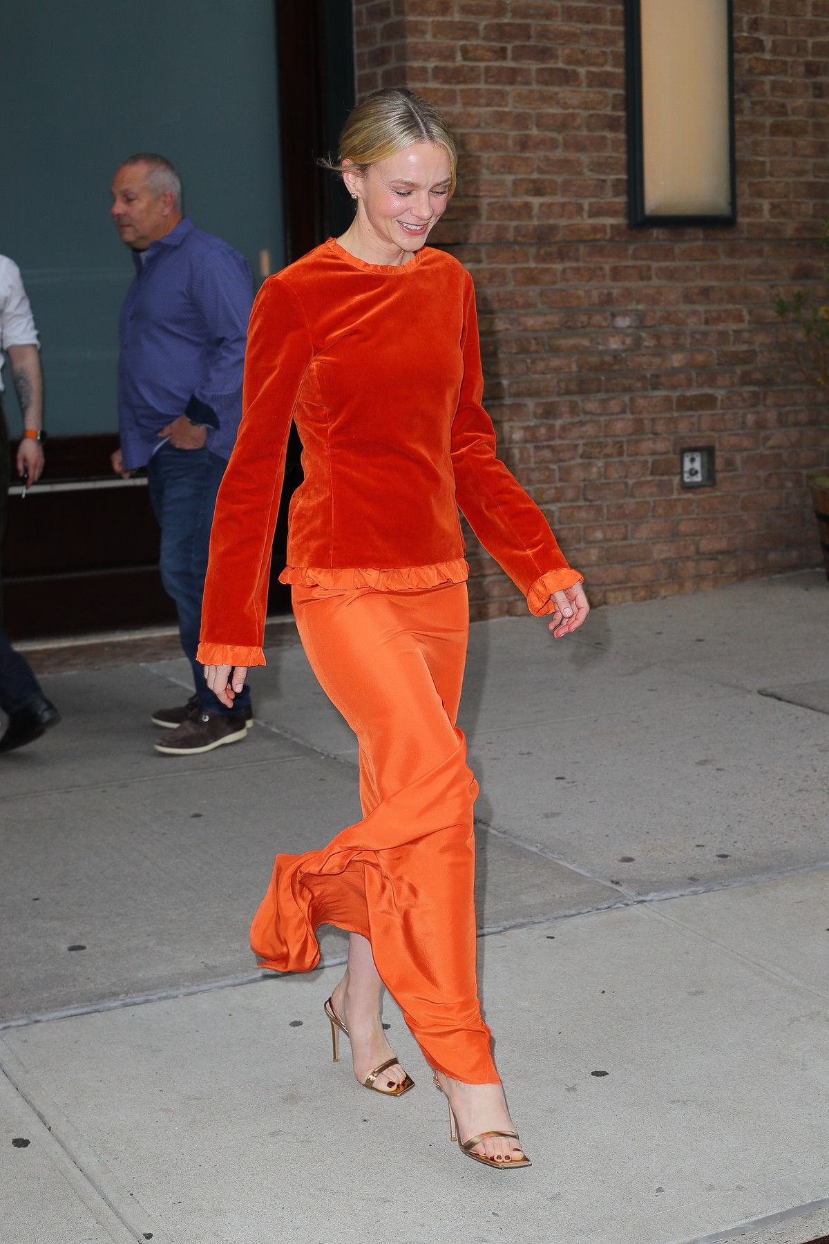 Σε πιο bold διάθεση, η Carey Mulligan υιοθετεί sunset αποχρώσεις και τις συνδυάζει με metallic πέδιλα, δημιουργώντας ένα look που ξεχωρίζει χωρίς υπερβολές.