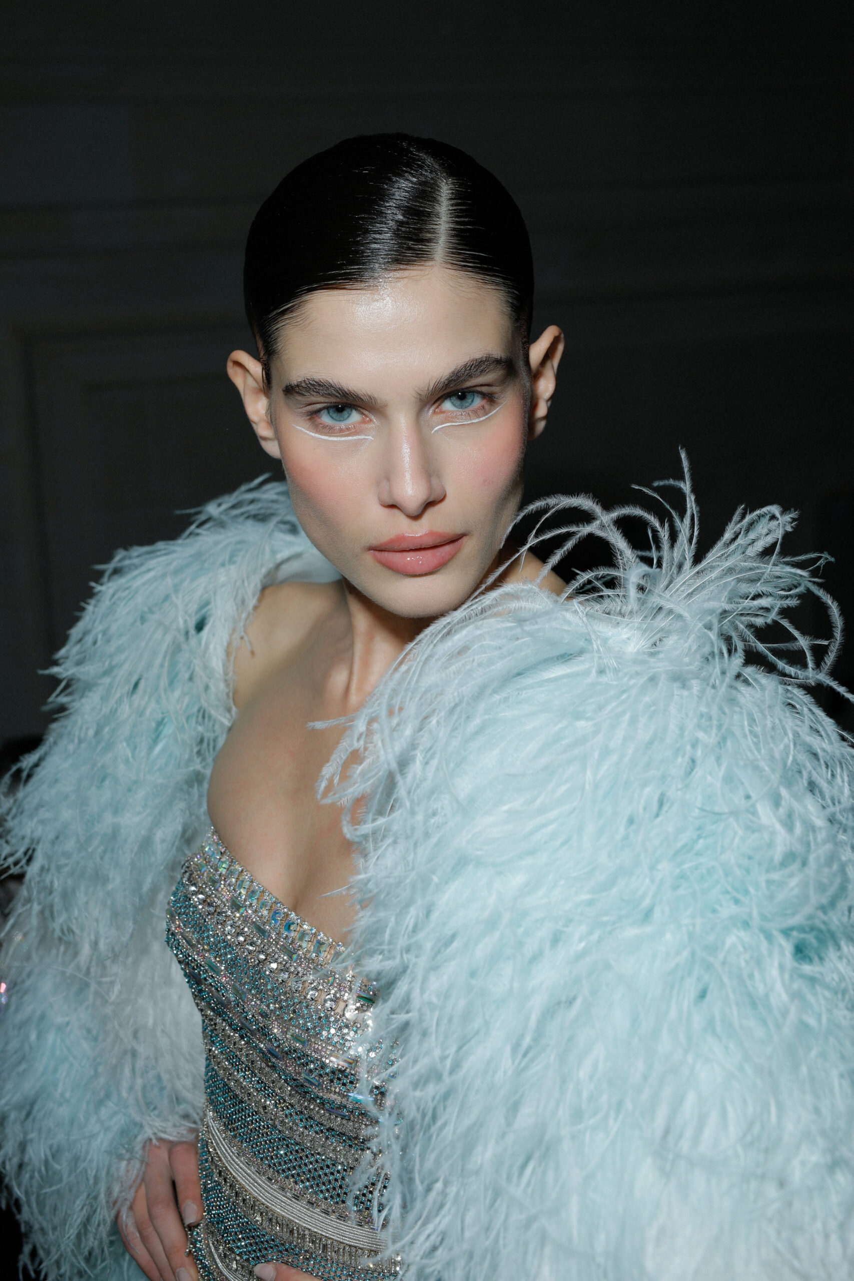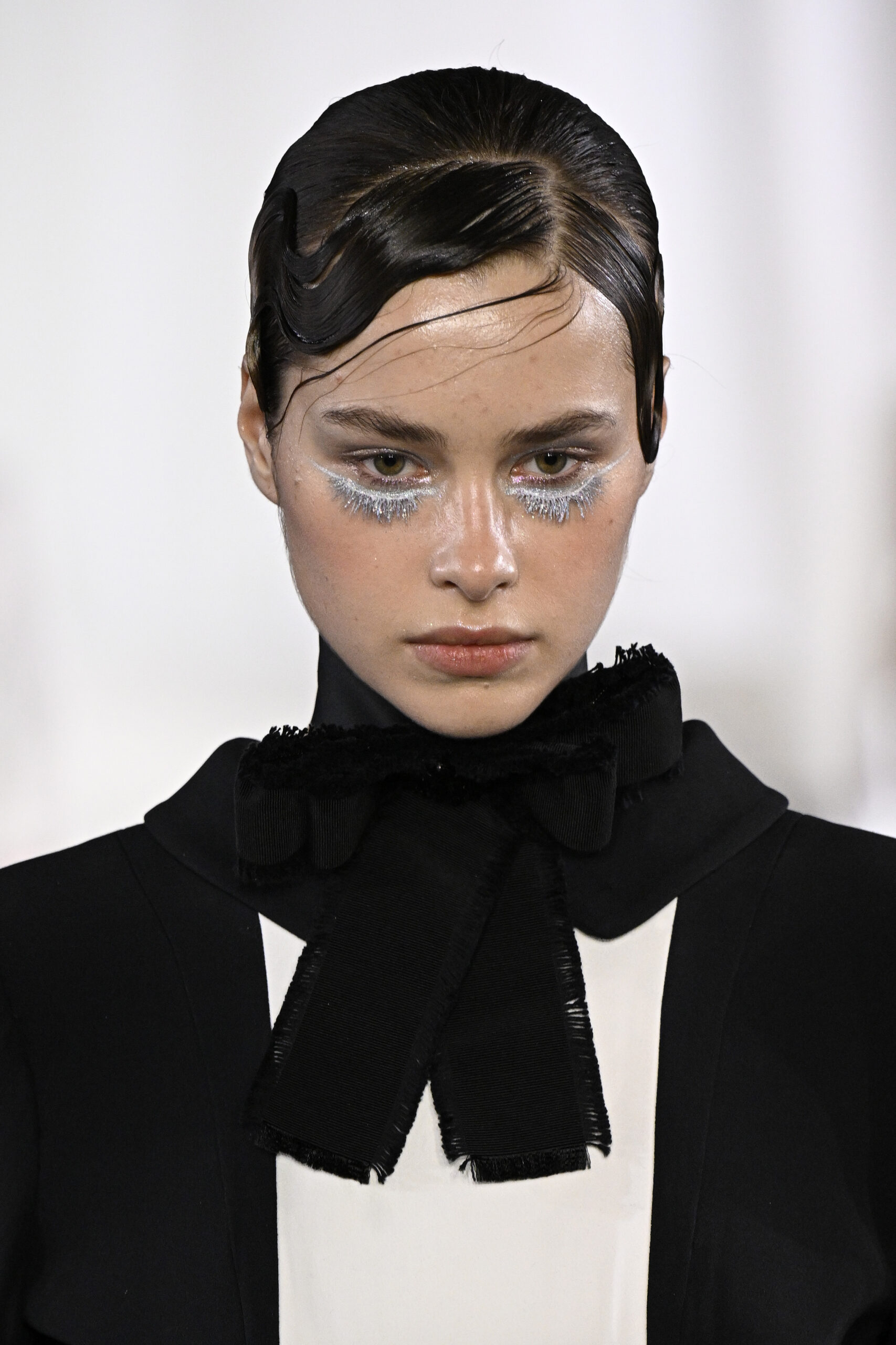 Το beauty look κινήθηκε στην ίδια ακριβώς γραμμή. Το μακιγιάζ της Val Garland έδινε έμφαση σε καθαρές επιδερμίδες, φωτεινά σημεία και διακριτικά τονισμένα μάτια, ενώ τα μαλλιά του Eugene Souleiman – άλλοτε sleek, άλλοτε απαλά κυματιστά – ολοκλήρωναν την εικόνα μιας γυναίκας διαχρονικά θηλυκής, αλλά σύγχρονης.