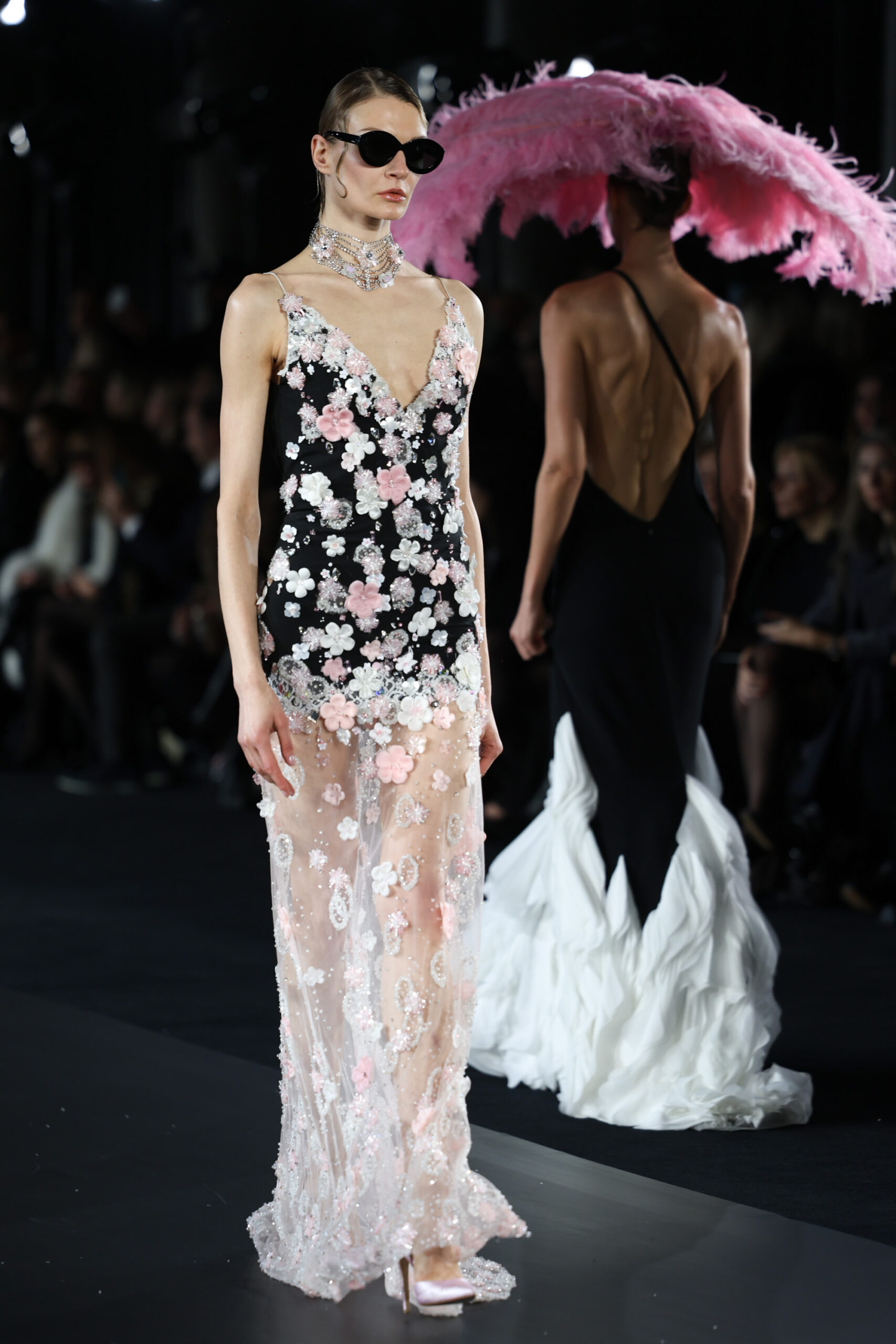 Τα φώτα σβήνουν και τα μοντέλα αρχίζουν να κατεβαίνουν τα σκαλιά της πασαρέλας σαν φιγούρες άλλης εποχής. Άλλωστε ο τίτλος της συλλογής ακούει στο όνομα Old Hollywood Avant-Première. Κρόσσια που κινούνται ρυθμικά. Φτερά που μοιάζουν να «χορεύουν». Εντυπωσιακές δαντέλες κεντημένες στο χέρι. Το μαύρο και το λευκό κυριαρχούν, ενώ μικρές εκρήξεις χρυσού, aqua, ροζ και κίτρινου εμφανίζονται σαν κινηματογραφικά highlights. Οι όγκοι αψηφούν τη βαρύτητα. Οι σιλουέτες άλλοτε αγκαλιάζουν, άλλοτε αιωρούνται. Και όλα δείχνουν να υπηρετούν μία ιδέα: τη γυναίκα ως πρωταγωνίστρια!