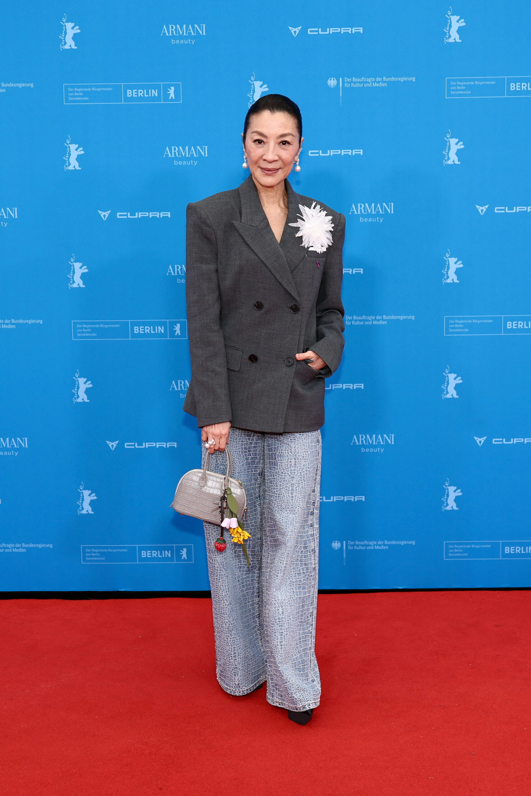 Η Michelle Yeoh απέδειξε για ακόμη μία φορά τη στιλιστική της ευελιξία, επιλέγοντας ένα croco-effect denim σύνολο που έδωσε νέα διάσταση στο κλασικό τζιν. Το συνδύασε με structured σακάκι διακοσμημένο με floral brooch στο πέτο, δημιουργώντας ένα look που ισορροπούσε ανάμεσα στο contemporary tailoring και τη θηλυκότητα. Σε μία ακόμη εμφάνισή της, κινήθηκε σε neutral αποχρώσεις, προσθέτοντας γραβάτα για ένα refined, daily chic αποτέλεσμα με διακριτικό ανδρόγυνο χαρακτήρα.
