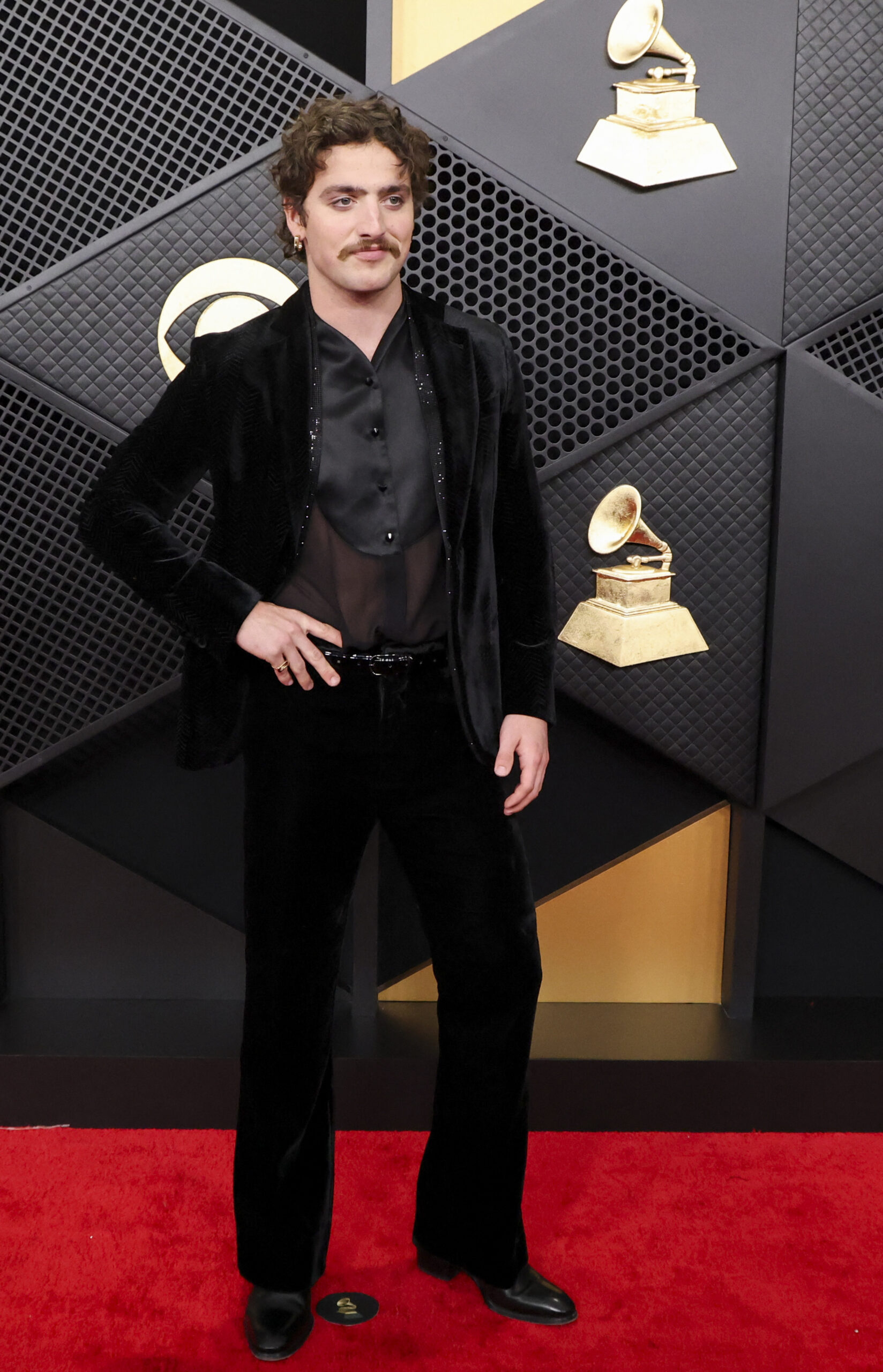 O Βenson Boone με sheer πουκάμισο και βελούδινο κουστούμι Giorgio Armani.