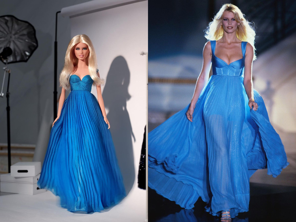 Στην πρώτη εκδοχή η Βarbie φοράει επικό Versace μπλε φόρεμα που φορούσε κατά τη διάρκεια της επίδειξης του Versace το φθινόπωρο / χειμώνα του 1994 η Schiffer!