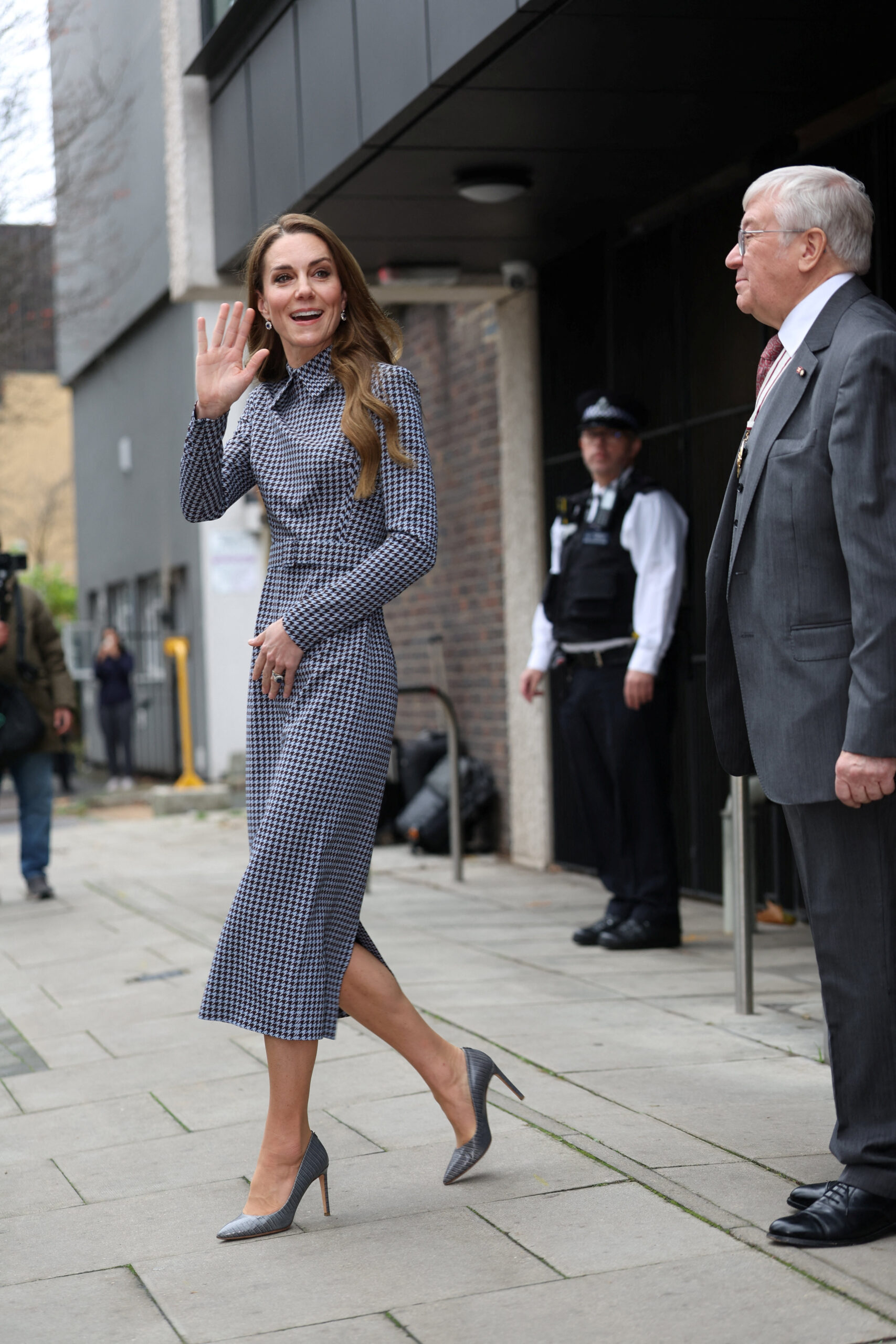 Η Πριγκίπισσα της Ουαλίας εμφανίστηκε με ένα υπέροχο midi φόρεμα pied de poule της σχεδιάστριας Emilia Wickstead, το οποίο συνδύασε με κομψές γόβες στην ίδια χρωματική παλέτα και μια mini suede tote bag που ολοκλήρωσε το look. Ένα outfit απλό, κλασικό και ταυτόχρονα so stylish—όπως μόνο εκείνη ξέρει να το κάνει.