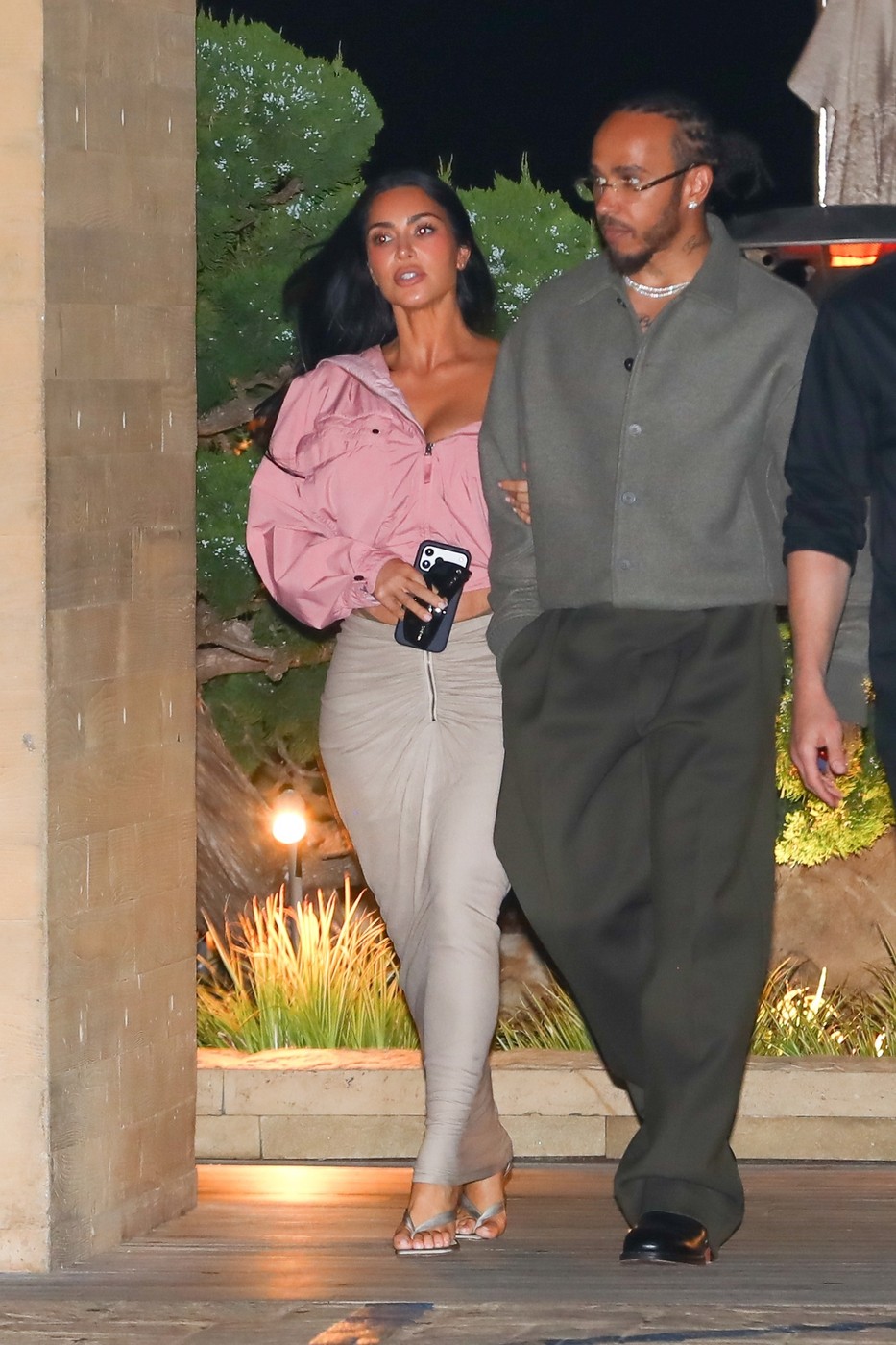 Η ιδρύτρια της SKIMS επέλεξε ένα ροζ sporty jacket με maxi φούστα σε neutral απόχρωση και mules, δημιουργώντας ένα look που ισορροπεί ανάμεσα στο casual και το θηλυκό. Από την άλλη, ο Hamilton κράτησε χαμηλούς τόνους με γκρι jacket και σκούρο παντελόνι, σε ένα effortless cool σύνολο.