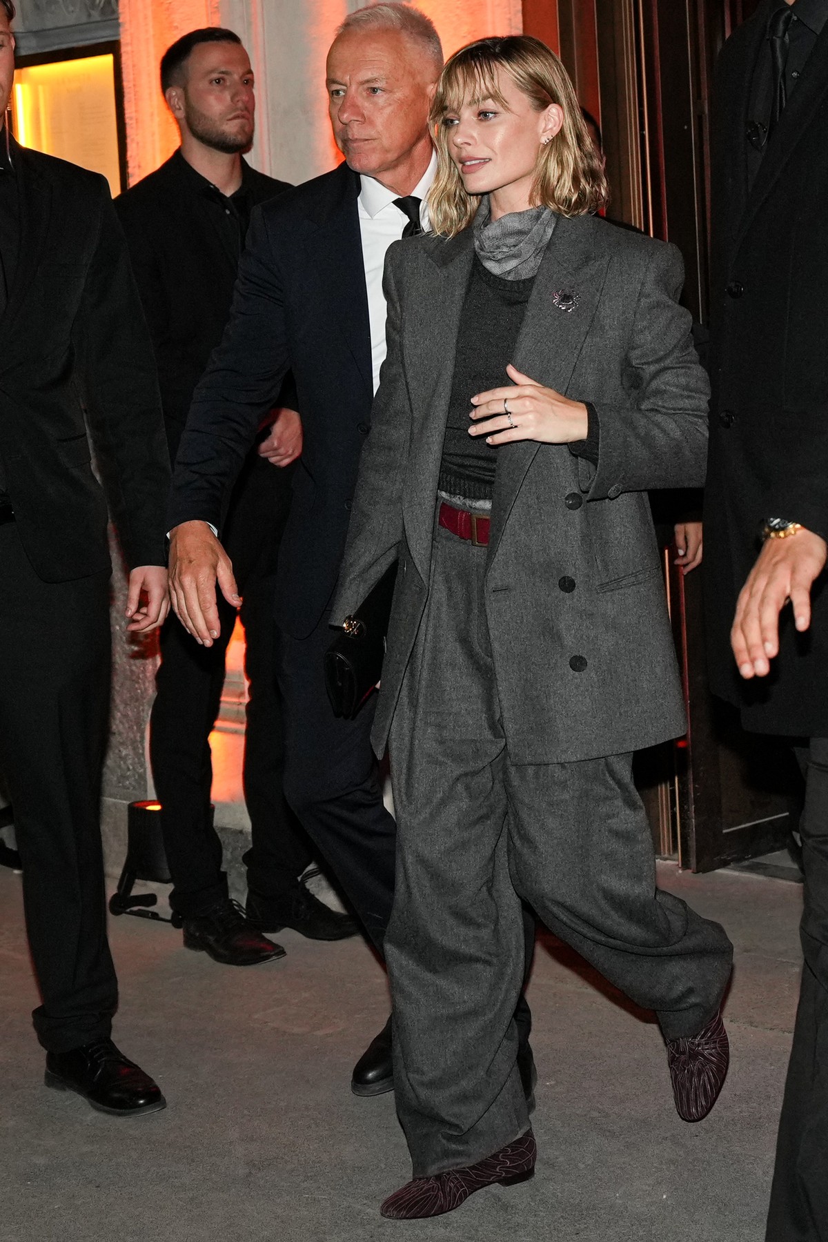 Από την άλλη, η Margot Robbie κινήθηκε σε ένα τελείως διαφορετικό mood, επιλέγοντας ένα oversized γκρι κοστούμι με ζιβάγκο στην ίδια απόχρωση. Έδωσε σχήμα στη σιλουέτα με μια κόκκινη ζώνη και ολοκλήρωσε το look με καφέ suede μπότες, αποφεύγοντας τα κλασικά τακούνια. Το αποτέλεσμα; Ένα σύγχρονο, relaxed και απόλυτα cool outfit που ισορροπεί ανάμεσα στο masculine tailoring και τη διακριτική θηλυκότητα.