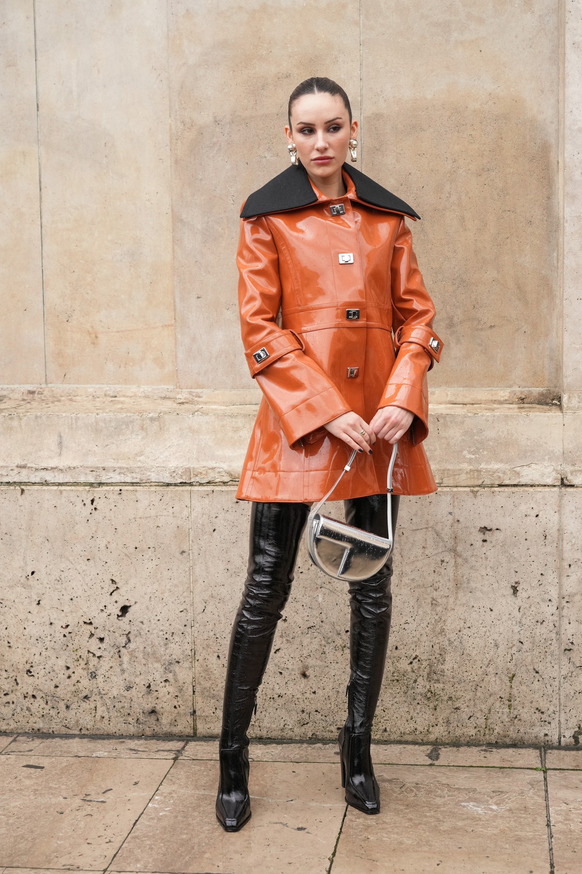 H Ashtin Earle με vinyl mini coat και δερμάτινες μπότες.