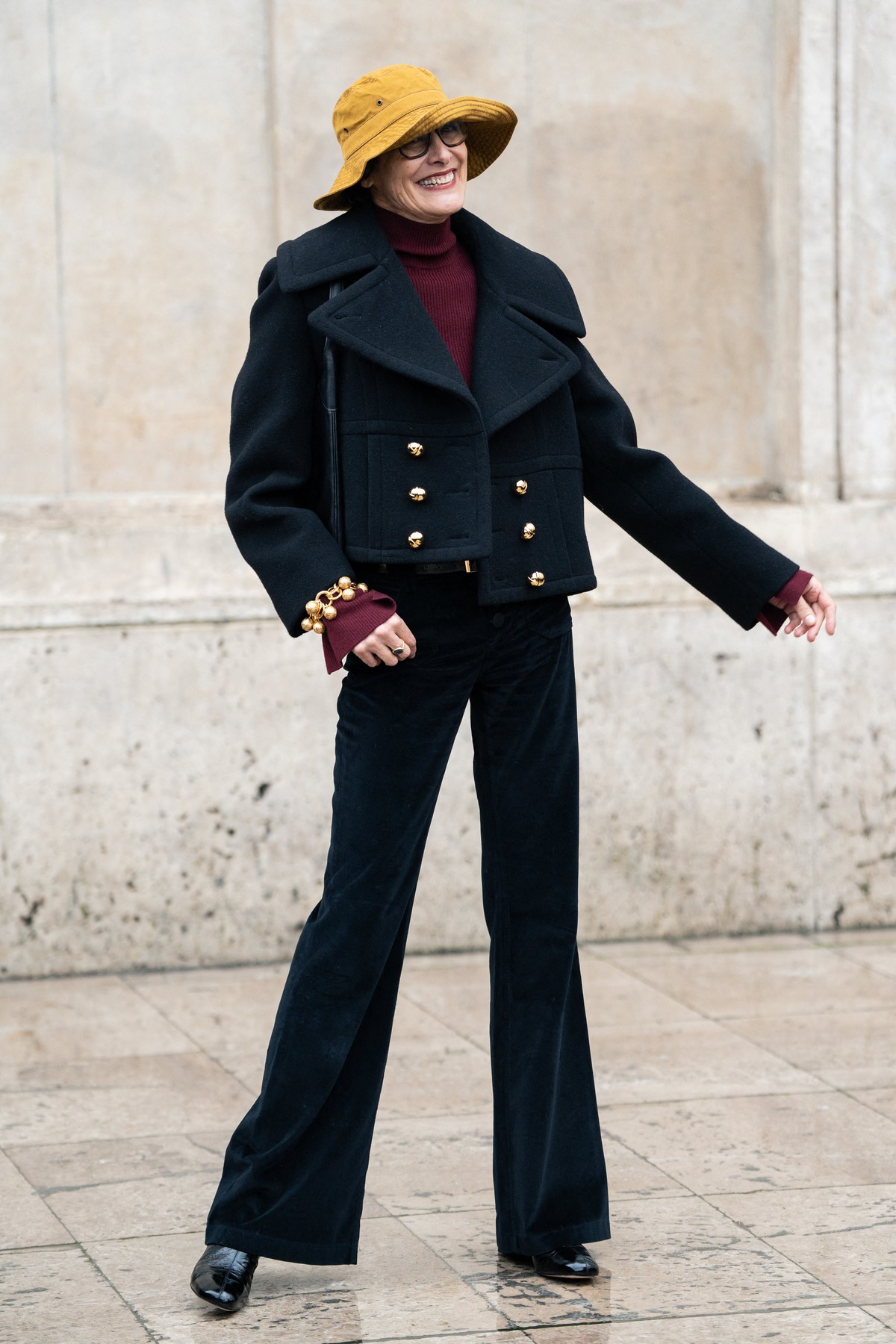 Η Ines de la Fressange με pea coat και rain hat σε τέλειο χρώμα.