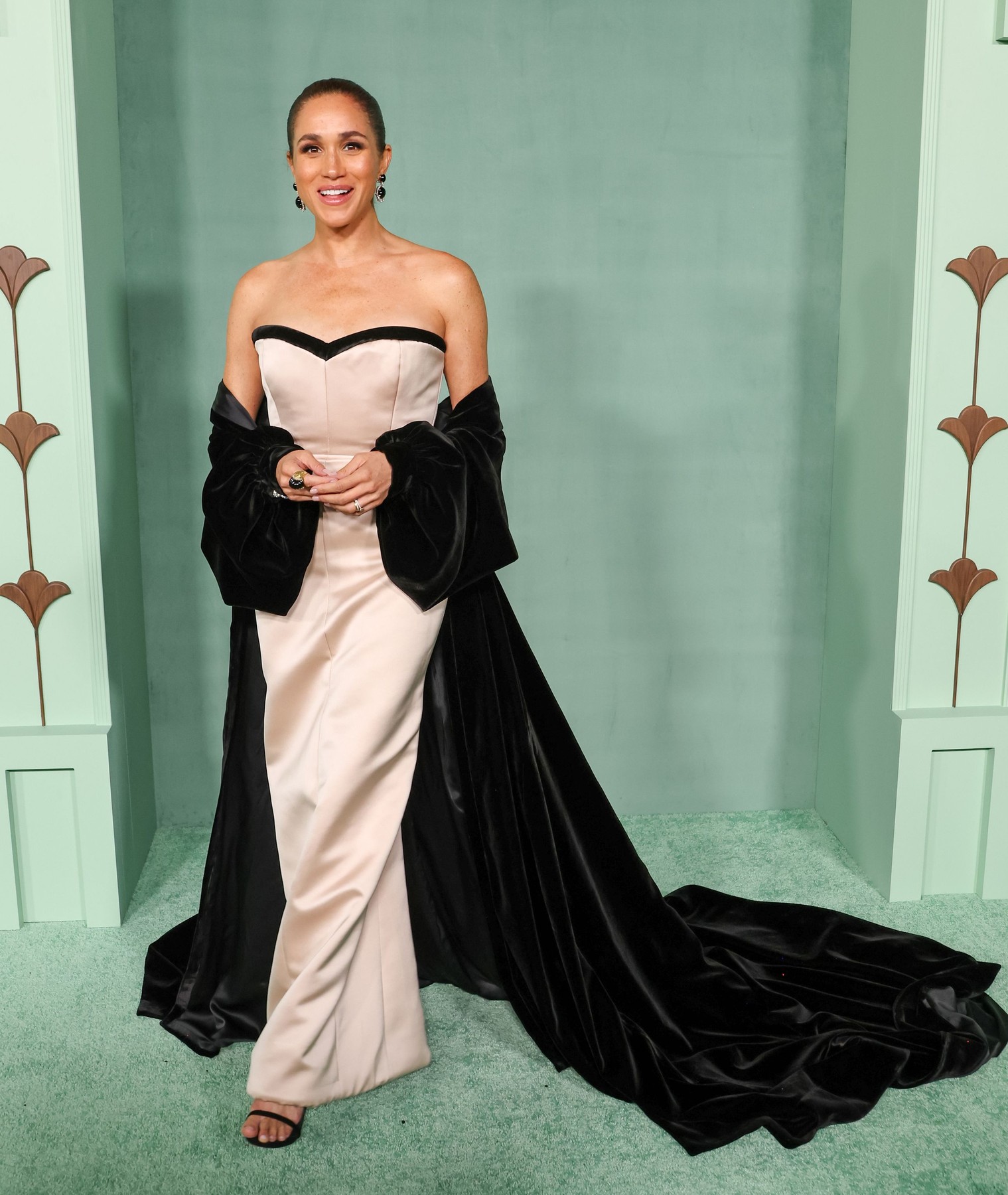Η Δούκισσα του Σάσεξ επέλεξε να παρευρεθεί μόνη της, αφήνοντας το στιλ της να μιλήσει από μόνο του. Περπάτησε στο mint-green χαλί φορώντας ένα στράπλες φόρεμα σε απόχρωση στρειδιού από τον οίκο Harbison Studio, με μαύρη λαιμόκοψη και άψογα tailored φούστα που αγκάλιαζε τη σιλουέτα της με κομψότητα.
