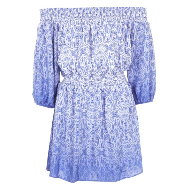 Ανάδειξε τους ώμους σου με ένα off the shoulder φόρεμα. Το μπλε του χρώμα ταιριάζει τέλεια σε διακοπές στο νησί!