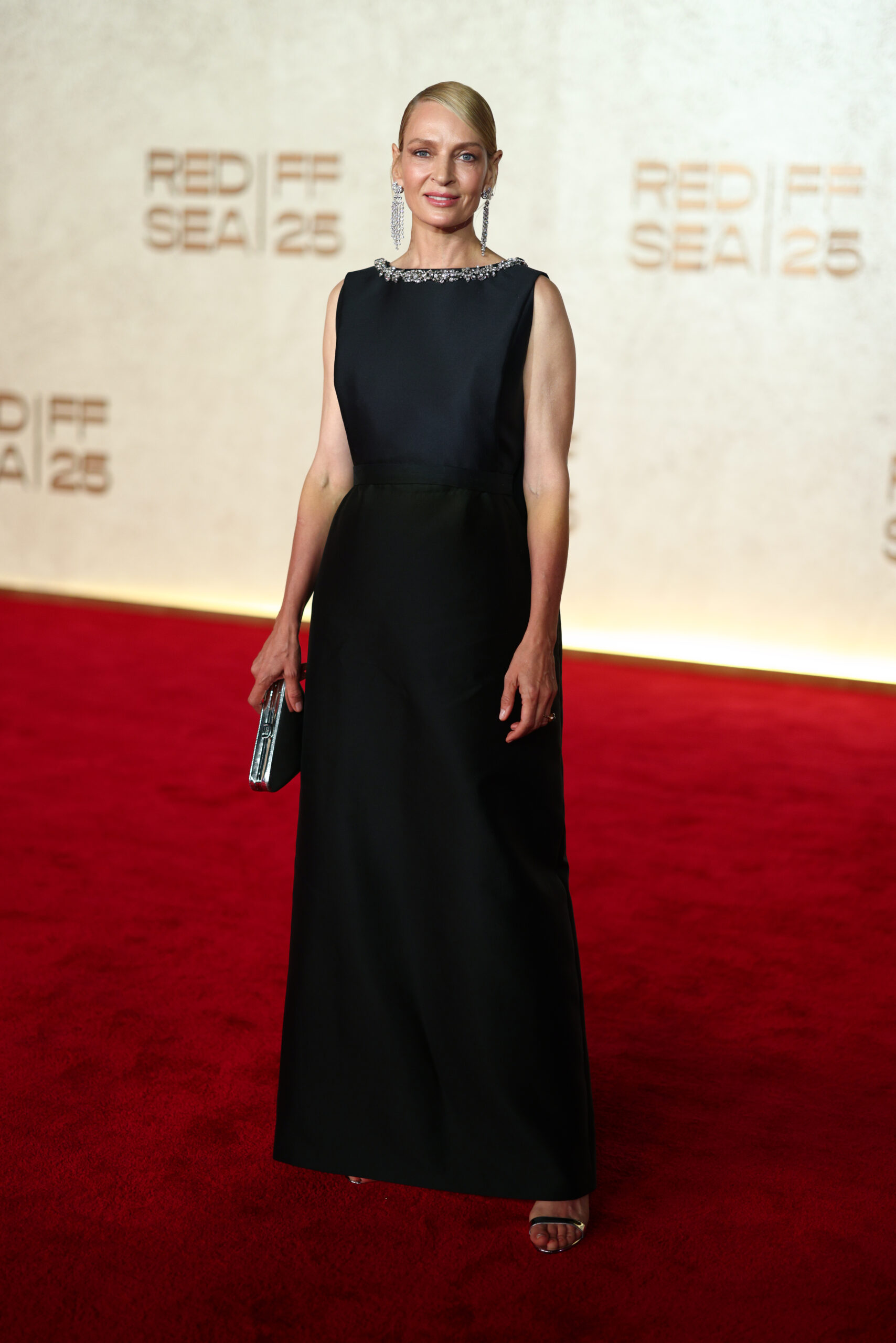 Η Uma Thurman επέλεξε μια εντυπωσιακή Prada gown, διακοσμημένη με λεπτομέρειες embellished, αποπνέοντας δυναμισμό και κομψότητα.