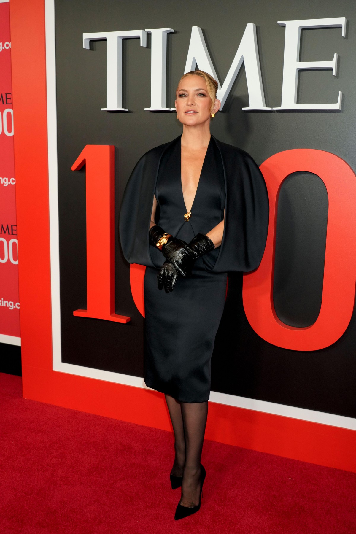 Εντυπωσιακή ήταν και η Kate Hudson, η οποία φόρεσε ένα sculptural black midi φόρεμα, συνδυάζοντάς το με χρυσή καρφίτσα και μαύρα γάντια, δίνοντας μια dramatic αλλά απόλυτα elegant αισθητική.