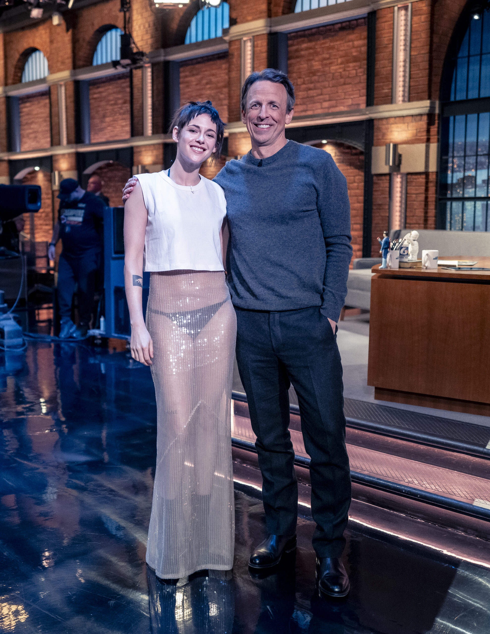 Η Stewart εντοπίστηκε καθ’ οδόν προς το πλατό του “Late Night With Seth Meyers”, φορώντας ένα λαμπερό, διάφανο slip dress από το brand The New Arrivals. Το αιθέριο ύφασμα του φορέματος και το μαύρο thong που φαινόταν από μέσα θα μπορούσαν εύκολα να παραπέμπουν σε ένα look βγαλμένο απευθείας από ρεβεγιόν Πρωτοχρονιάς. Ή red carpet! Όμως η Kristen Stewart δεν ήταν ποτέ από εκείνες που ακολουθούν τους κανόνες χωρίς να τους «πειράζουν».