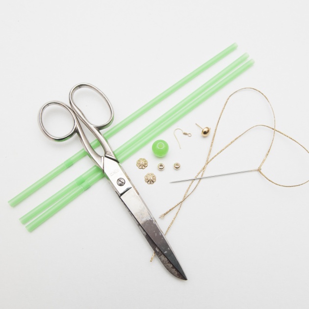 Τα υλικά που θα χρειαστείς είναι τα εξής: Κλωστή κεντήματος ή κηροκλωστή χρυσή, μερικά καλαμάκια, κουμπώματα για κρεμαστά σκουλαρίκια, 2 χάντρες, 4 βάσεις χάντρας και βελόνι. Εμείς θα σου δείξουμε τη διαδικασία για το ένα σκουλαρίκι κι εσύ κάνε το ίδιο και για το δεύτερο.