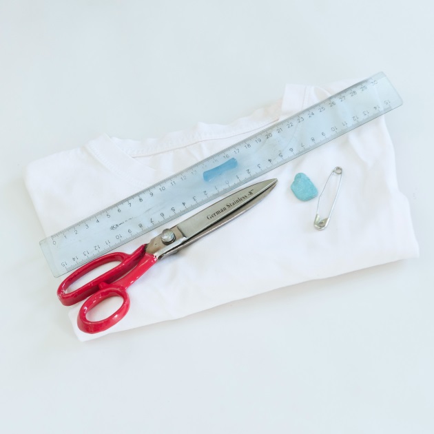 Τα υλικά που θα χρειαστείς είναι τα εξής: Ένα παλιό σου t-shirt, κιμωλία, μια παραμάνα, ψαλίδι, και χάρακα.