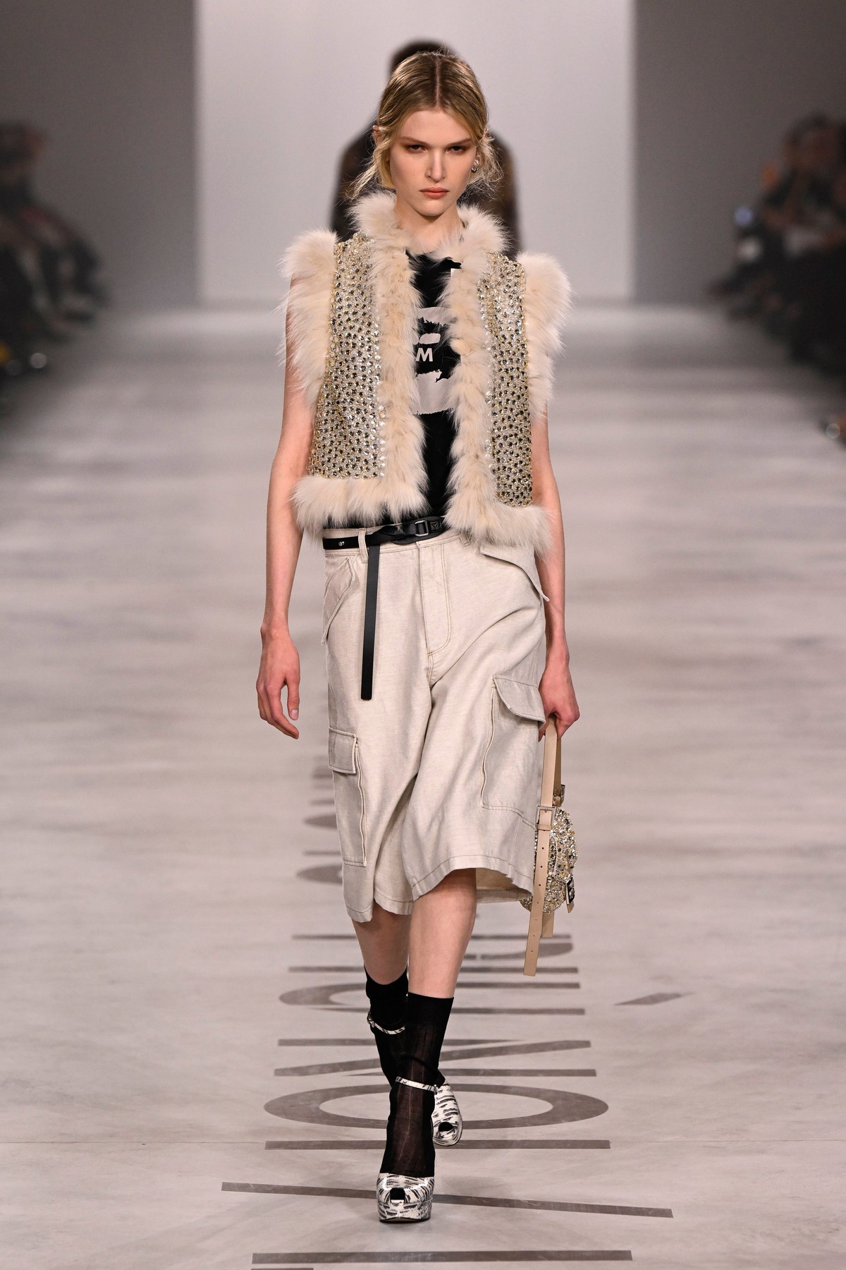 Στη συνέχεια, η συλλογή πέρασε σε μια πιο relaxed, urban αισθητική. Denim, cargo παντελόνια και parkas επανήλθαν δυναμικά, φέρνοντας μια πιο σύγχρονη και λειτουργική διάσταση στον κόσμο της Fendi. Η Chiuri φάνηκε να επιδιώκει μια σύνδεση με την πραγματικότητα, δημιουργώντας ρούχα που μπορούν να ενταχθούν οργανικά στη ζωή της γυναίκας του σήμερα, χωρίς να χάνουν την πολυτελή τους ταυτότητα.