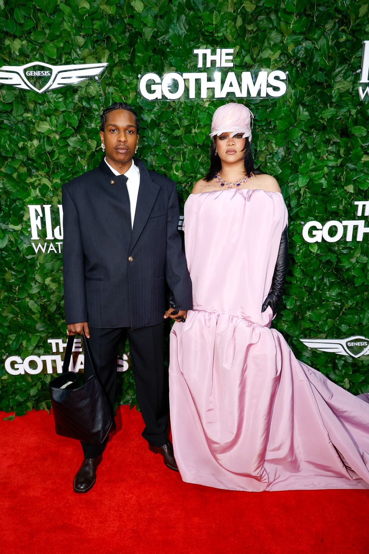 Το look ολοκληρώθηκε με μαύρα opera gloves και matching ροζ headwrap, ενώ στο πλευρό της ο A$AP Rocky εμφανίστηκε σε total Chanel, υπογραμμίζοντας το power couple styling τους.