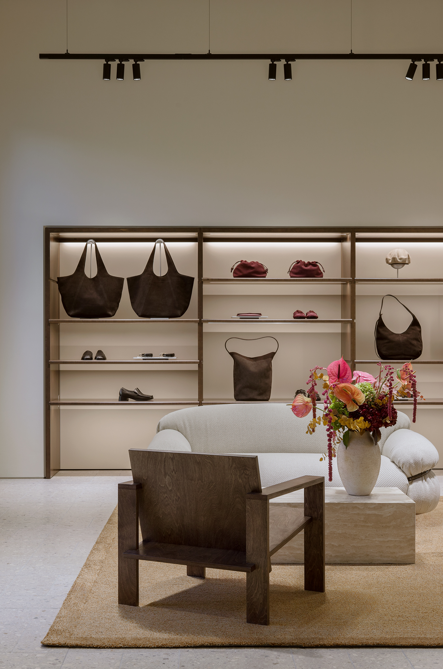 Τα επιλεγμένα έπιπλα αντικατοπτρίζουν τον σεβασμό της μάρκας προς τη διαχρονική δεξιοτεχνία. Οι συλλογές ready-to-wear και τα αξεσουάρ παρουσιάζονται σε αλουμινένιες ράγες και βιτρίνες με ράφια από ανακυκλωμένα υλικά της Smile Plastics. Τα τραπέζια της PAPER FACTOR – κατασκευασμένα στην Ιταλία από σύνθετο υλικό που περιλαμβάνει ανακυκλωμένες ίνες κυτταρίνης και φυσικές χρωστικές από τη γη – προσθέτουν ζεστασιά, υλικότητα και μια χειροποίητη αίσθηση στον χώρο.