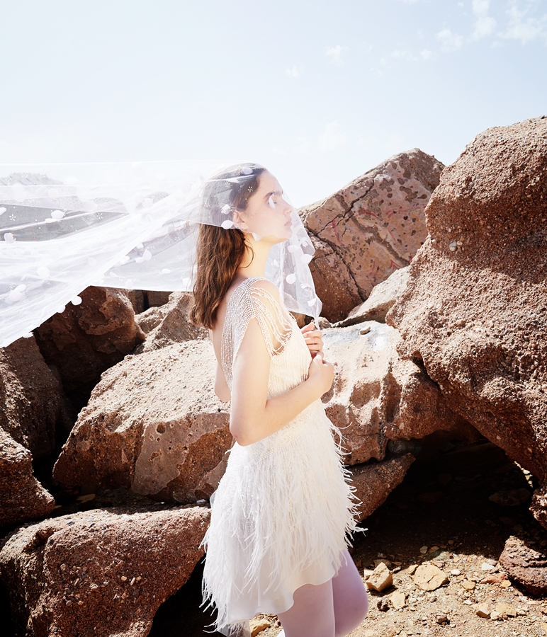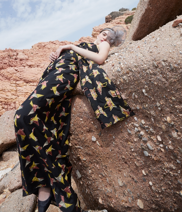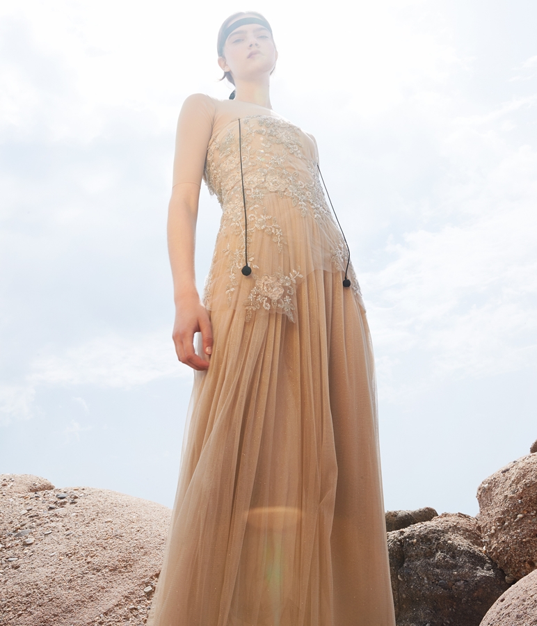 Τα υφάσματα ακολουθούν τη μυθική διαδικασία, είναι όλα μεταξωτά, διαφάνειες, λατρεμένες μουσελίνες ή φίνο washed satin (επεξεργασμένο, πετροπλυμένο σατέν). Οι πόρπες, οι κεντημένες τιράντες στο χέρι, τα κεντημένα με μικρά κρυσταλλάκια τελειώματα προκαλούν για χάδι. Τα ακουμπάς να νιώσεις την ενέργεια. Η χειροποίητη πολυτέλεια προσφέρει μια αλλόκοτη σιγουριά -σαν να νικάει τον χρόνο.