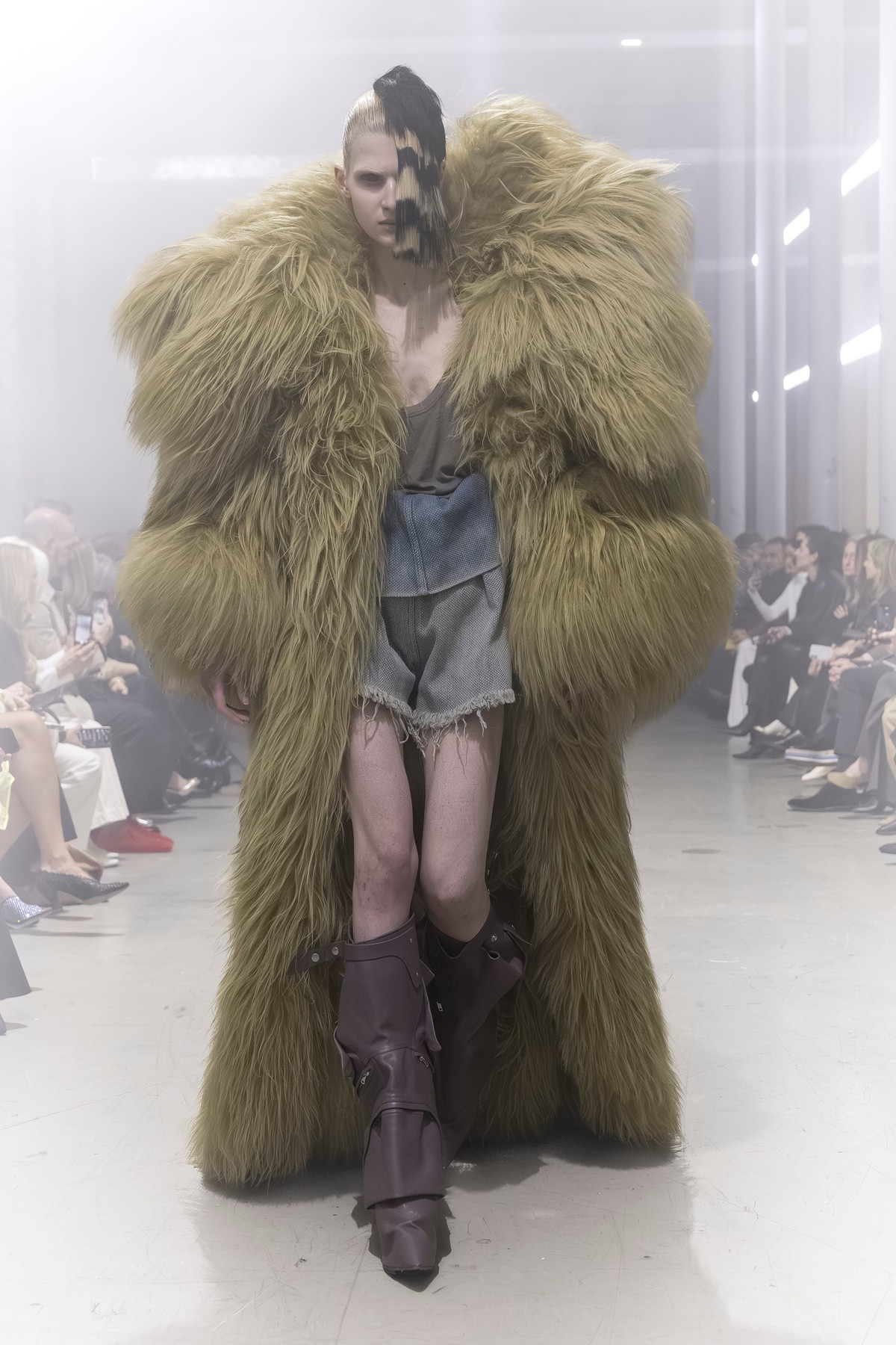 Το look ολοκληρωνόταν με δραματικά beauty στοιχεία: μισοξυρισμένα κουρέματα και τις χαρακτηριστικές μπότες Kiss, διακοσμημένες με πούλιες, που πρόσθεταν μια glam-rock πινελιά στο σκοτεινό σύμπαν του σχεδιαστή.