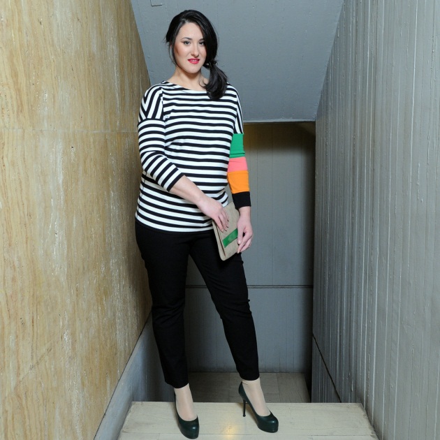 Όταν φοράμε ρίγες στα ρούχα πρέπει να είμαστε προσεκτικές. Οι οριζόντιες ρίγες δίνουν όγκο και τονίζουν περισσότερο τις γραμμές του σώματος μας γι αυτό το λόγο ησυγκεκριμένη μπλούζα είναι λάθος. Αντίθετα οι κάθετες ρίγες δίνουν ύψος και κολακεύουν.