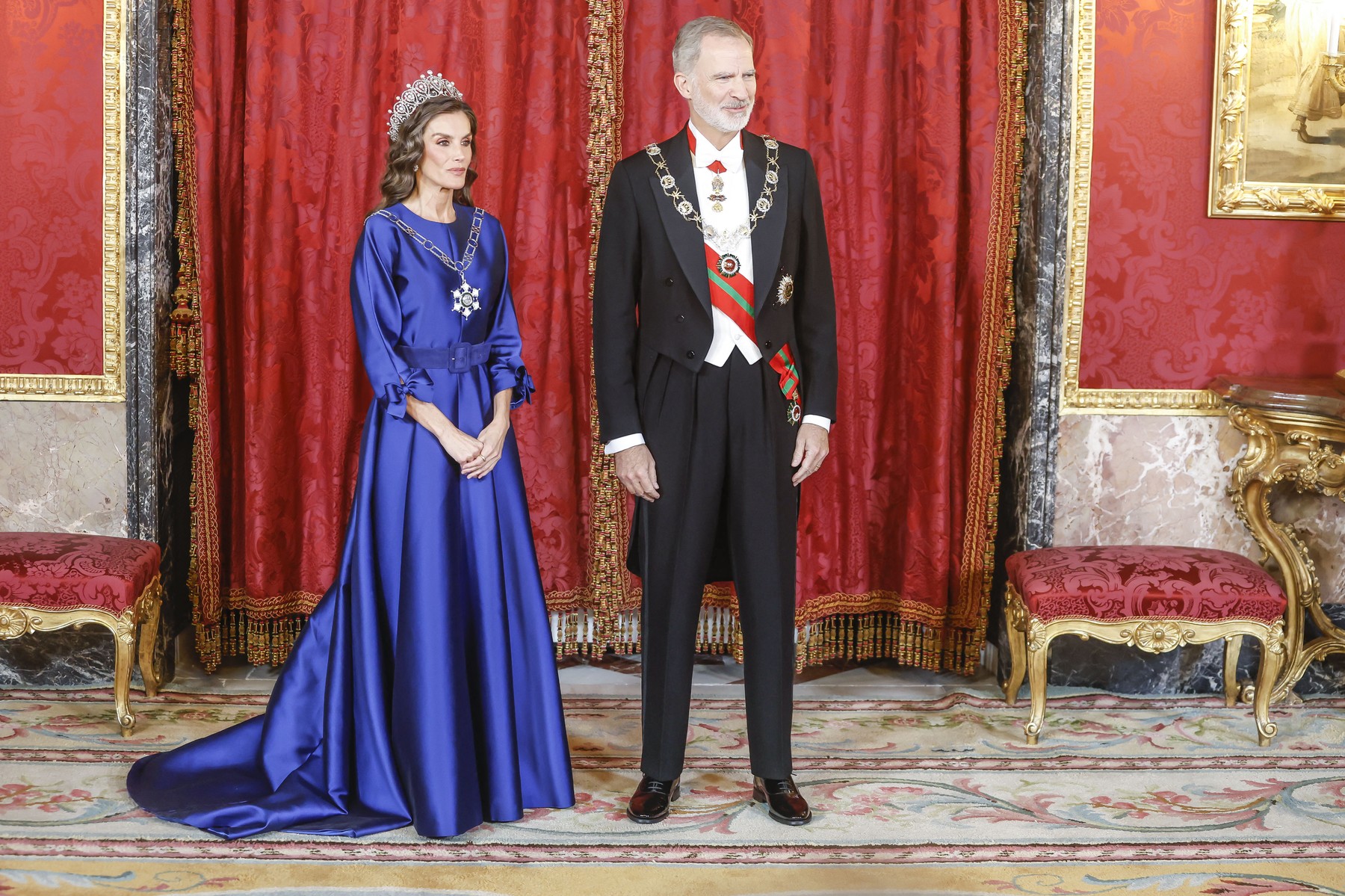 Η βασίλισσα Λετίθια, γνωστή για το εκλεπτυσμένο γούστο και τη μοντέρνα προσέγγισή της στη βασιλική μόδα, επέλεξε να συνδυάσει την τιάρα με ένα κομψό χτένισμα σε καστανές μπούκλες, με ασημένιες ανταύγειες που τόνιζαν την αίγλη του κοσμήματος.