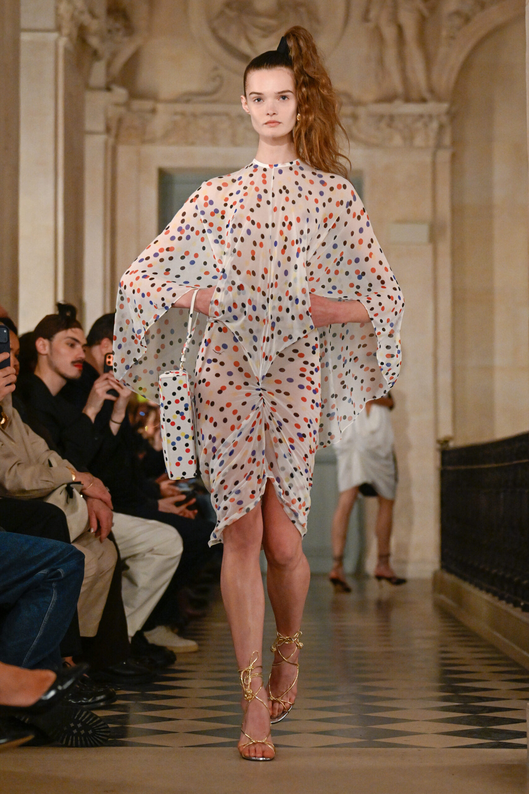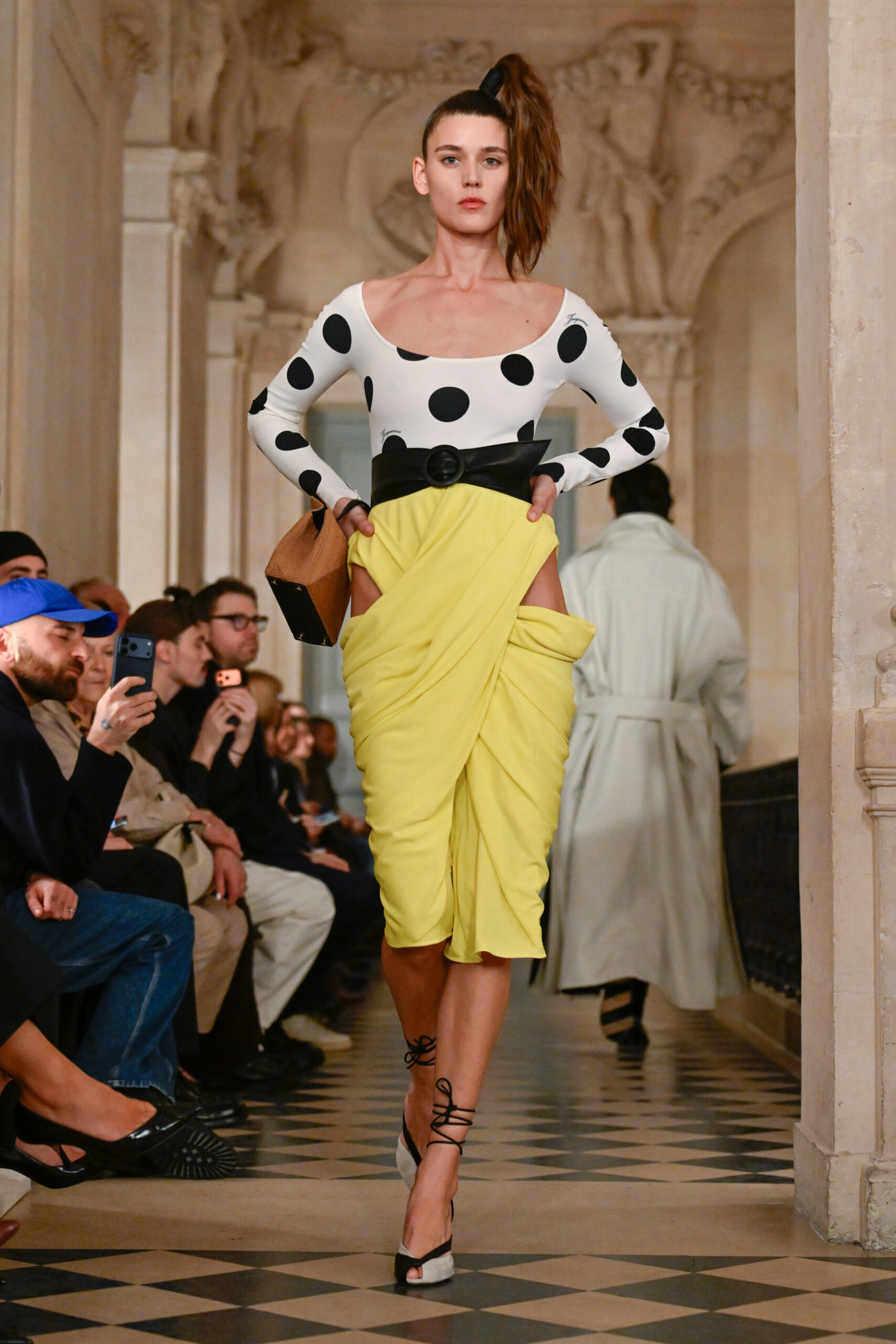 Οι φούστες αγκάλιαζαν τους γοφούς πριν ανοίξουν σε έντονα βολάν κάτω από το γόνατο, δημιουργώντας ένα θεατρικό, σχεδόν υπερβολικό αποτέλεσμα — ακριβώς όπως αγαπά ο Jacquemus.