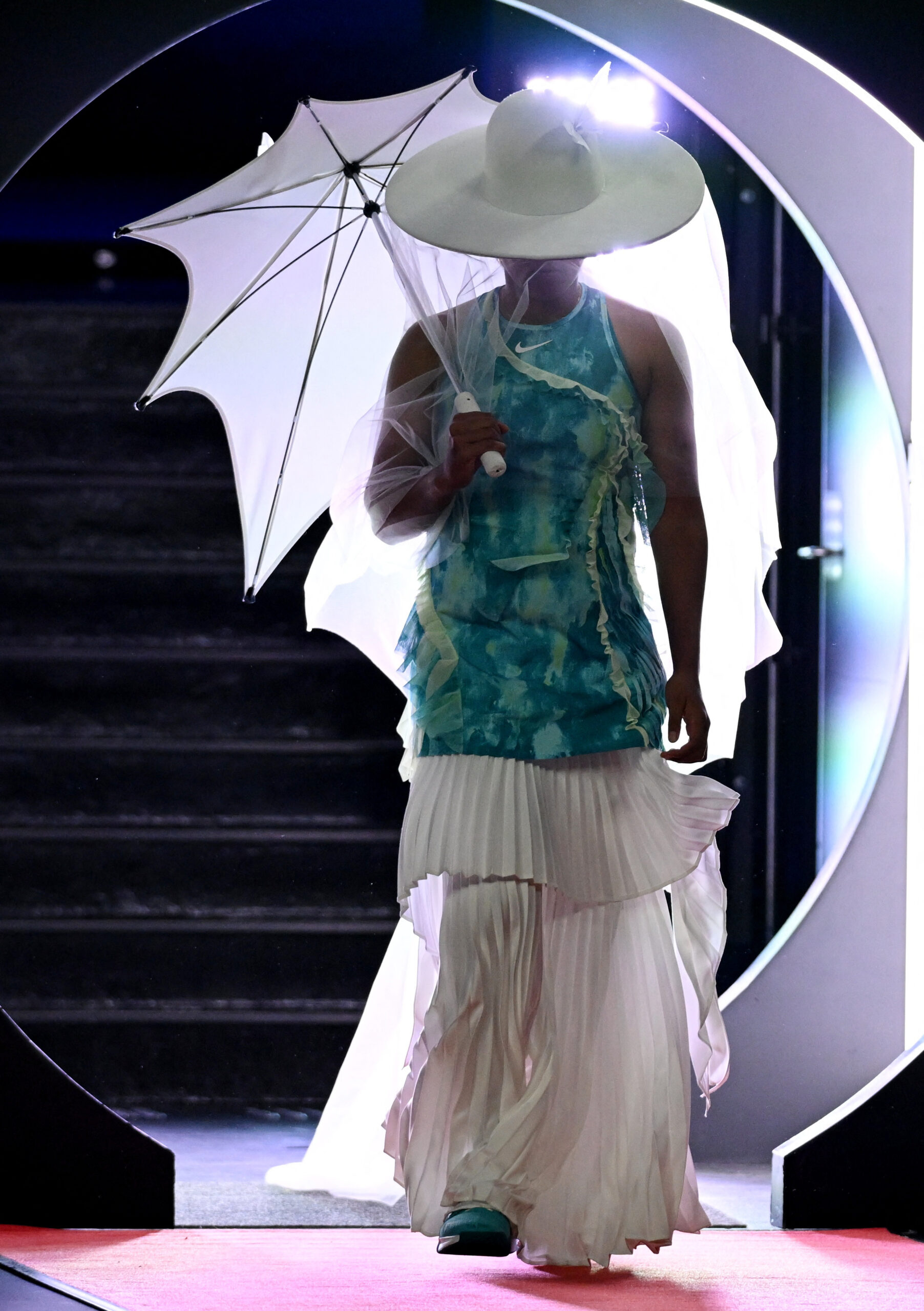 Εμπνευσμένη από τη μέδουσα —σύμβολο κομψότητας και κρυμμένης δύναμης— η Osaka φόρεσε ένα τιρκουάζ-πράσινο tie-dye zip-up με διάφανες λεπτομέρειες και οργανικά «πλοκάμια», σε συνεργασία με τη Nike. Το look ολοκληρώθηκε με δημιουργία του σχεδιαστή Robert Wun, προσθέτοντας καλλιτεχνικό και συμβολικό χαρακτήρα στην εμφάνισή της.
