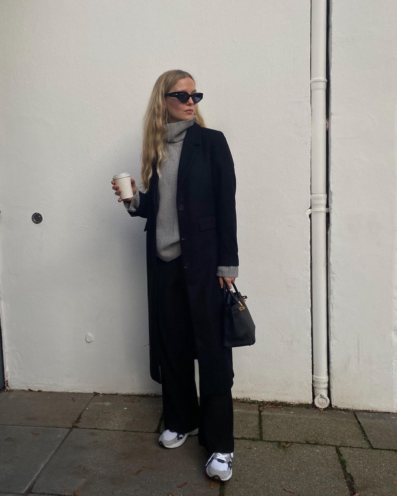Kλαδικά αγαπημένα, sneakers και μαύρο παντελόνι για όλη μέρα κάθε μέρα μαζί με το μαύρο σου παλτό.