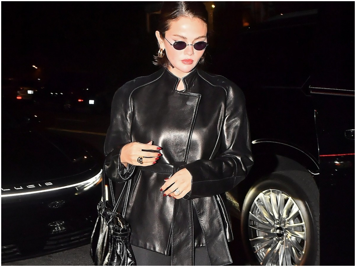 Η μεγιστάνας της Rare Beauty και pop star εμφανίστηκε σε δείπνο γενεθλίων με ένα total black look, αποδεικνύοντας ότι δεν ακολουθεί τυφλά τις τάσεις. Την προσοχή έκλεψε το πανωφόρι της: ένα δερμάτινο σακάκι από μαλακό δέρμα, με wrap σχέδιο και ζώνη στη μέση, που χάριζε άψογο shape και κομψή θηλυκότητα στο σύνολο.