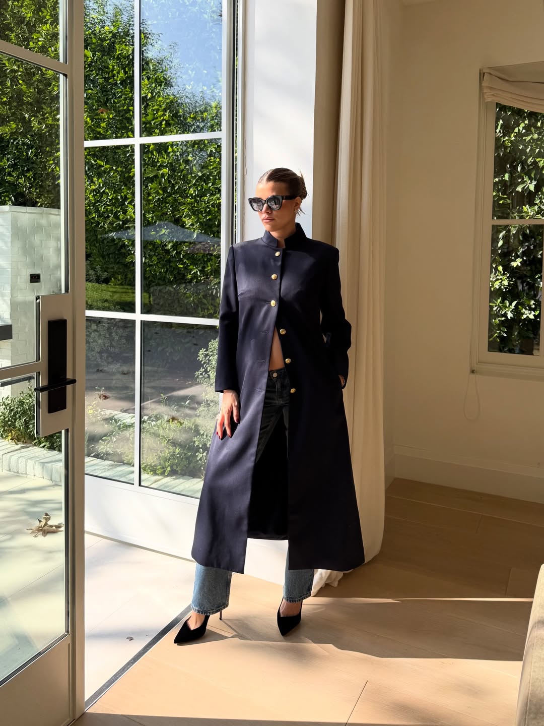 Φόρεσε ένα μακρύ ναυτικό μπλε παλτό με αυστηρό γιακά αξιωματικού, αφήνοντας διακριτικά να διαφαίνεται η κοιλιά της, ένα ευθύ, minimal τζιν και μαύρες γόβες — ένα σύνολο που ισορροπεί άψογα ανάμεσα στη ραφιναρισμένη απλότητα και την καθημερινή πολυτέλεια.Η επιλογή των neutral τόνων και των καθαρών γραμμών αντικατοπτρίζει την “quiet luxury” αισθητική που έχει υιοθετήσει τα τελευταία χρόνια και την έχει καταστήσει πρότυπο για τη νέα γενιά γυναικών που επιλέγουν το understatement αντί του εντυπωσιασμού.
