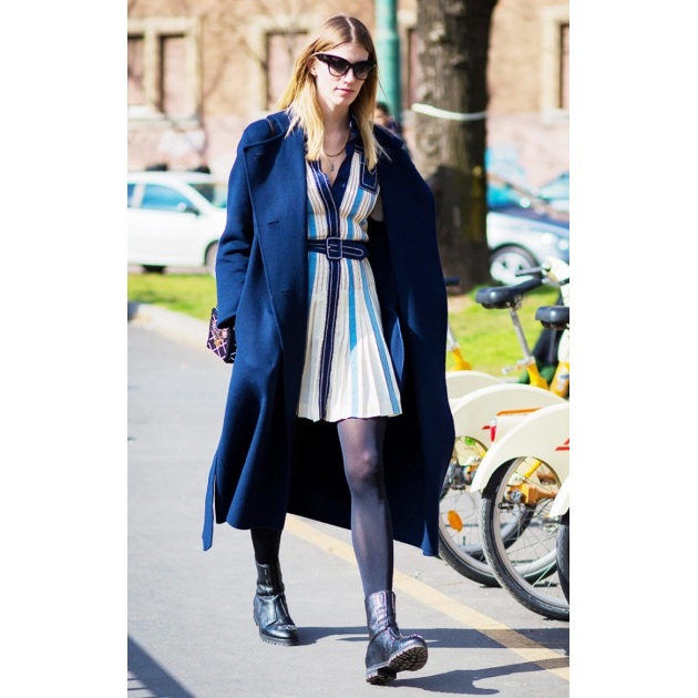 Φόρεσε ένα μίνι φόρεμα με οπάκ καλσόν, μαύρα booties και ολοκλήρωσε το look με ένα μακρύ παλτό.