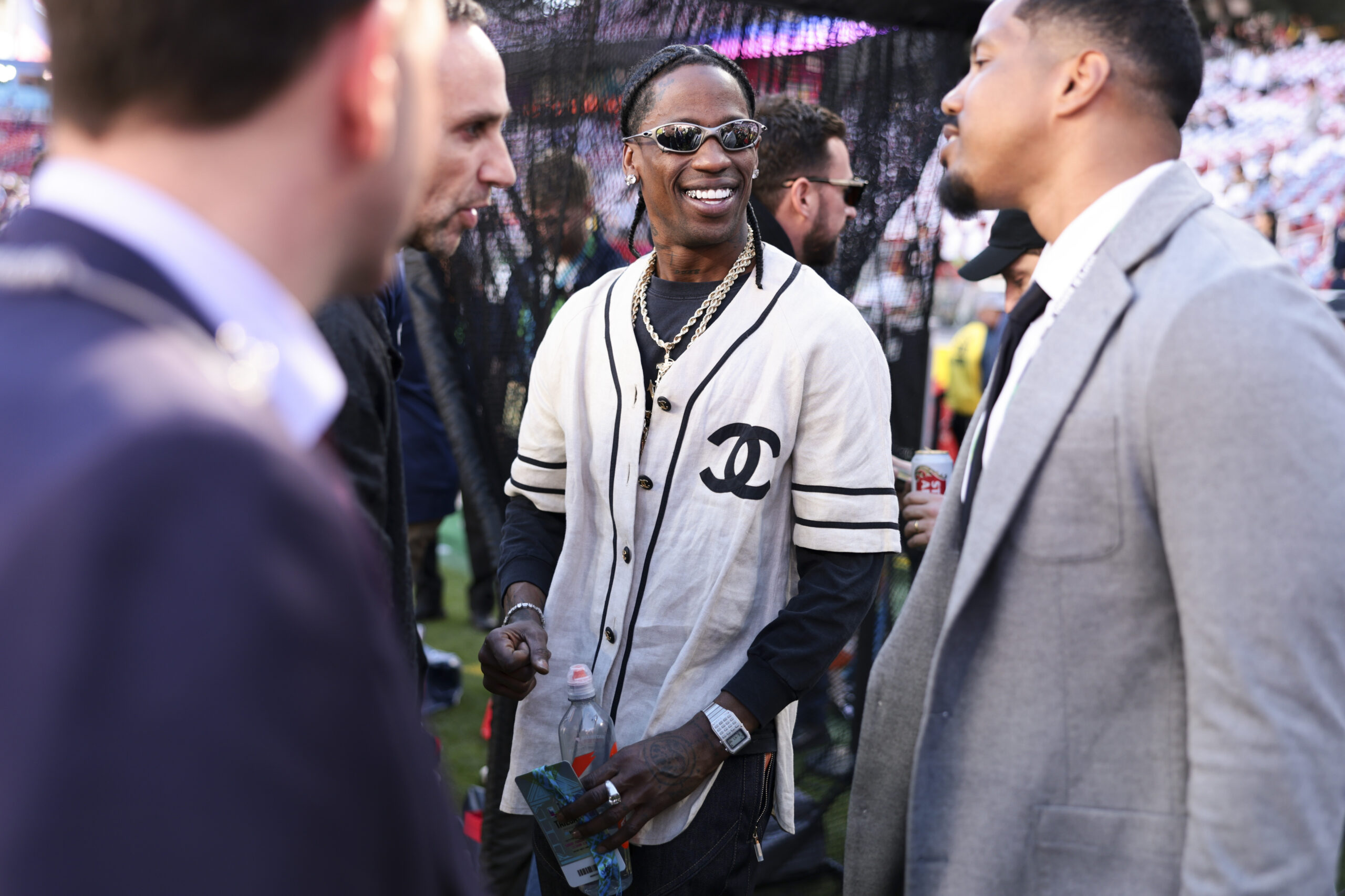 Ο Travis Scott υιοθέτησε ένα vintage luxury ύφος στα sidelines του Super Bowl LX 2026, φορώντας μια κρεμ λινή μπέιζμπολ φανέλα Chanel από το 1989, διακοσμημένη με το χαρακτηριστικό διπλό λογότυπο CC του οίκου και αντιθετικές λεπτομέρειες. Ο ράπερ, συνδύασε το κομμάτι με σκούρα layers και βαριές χρυσές αλυσίδες, καθώς και με ένα vintage ψηφιακό ρολόι Seiko.