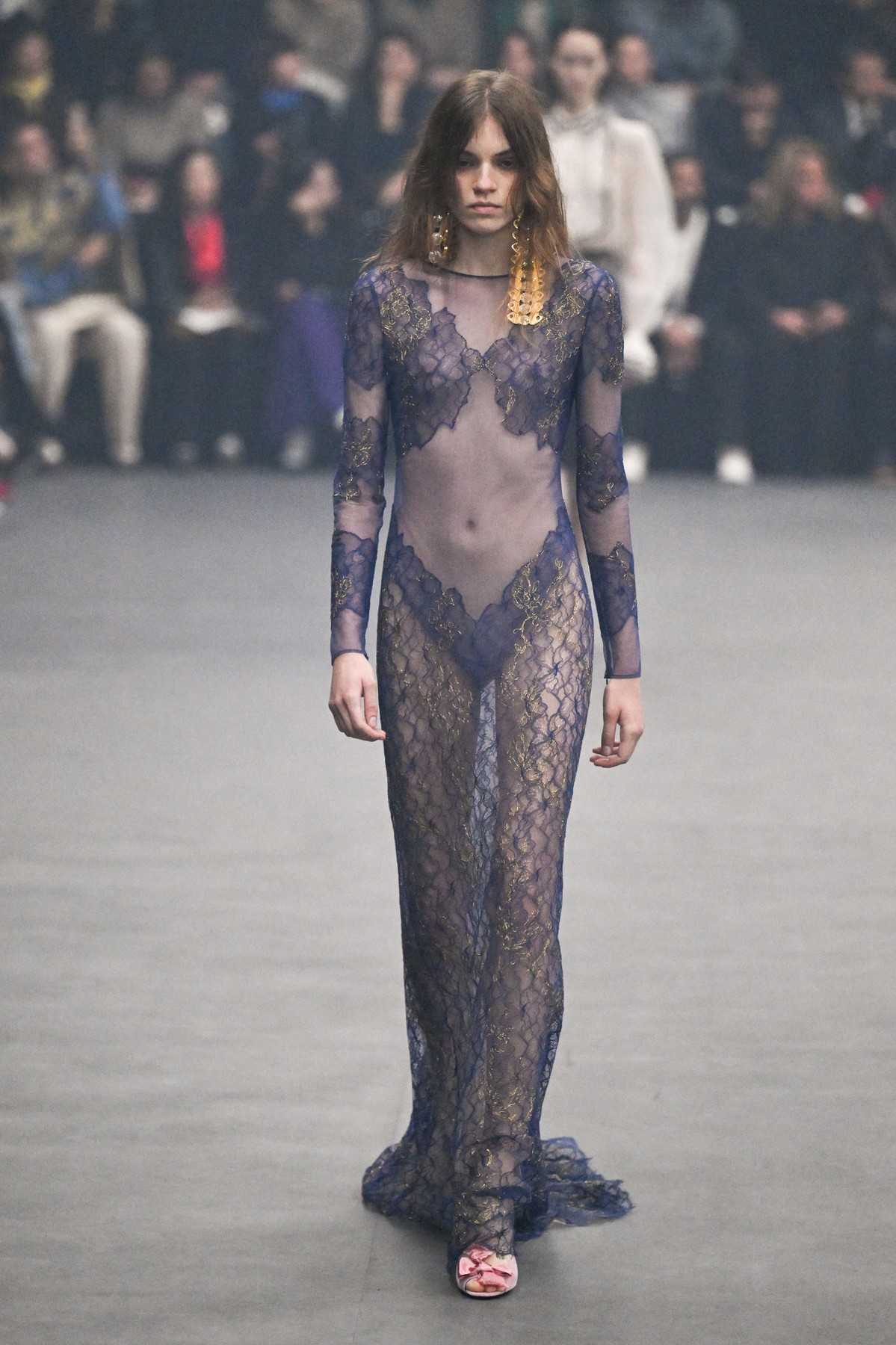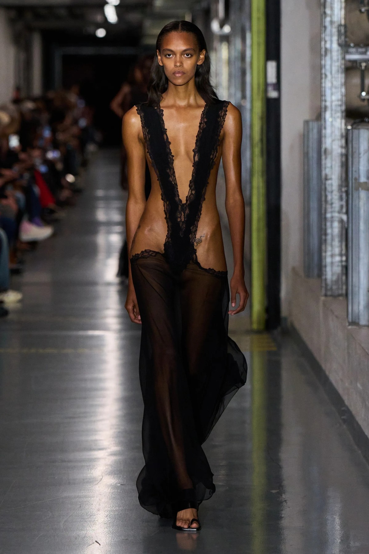 Ο Duran Lantink, στο ντεμπούτο του για τον οίκο, παρουσίασε μια συλλογή γεμάτη ανατροπές. Τατουάζ, ναυτικά ριγέ, μεταλλικές λεπτομέρειες και τα εμβληματικά κωνικά σουτιέν πλημμύρισαν την πασαρέλα υπό house μουσική και φώτα strobe. Αν και οι αντιδράσεις ήταν ανάμεικτες, πολλοί βλέπουν σε εκείνον τον νέο enfant terrible της γαλλικής μόδας. Ο χρόνος θα δείξει!