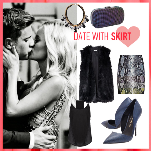 Φούστα με snakeskin ύφασμα. Συνδύασέ την με ένα μαύρο πουλόβερ και μαύρα πέδιλα.
