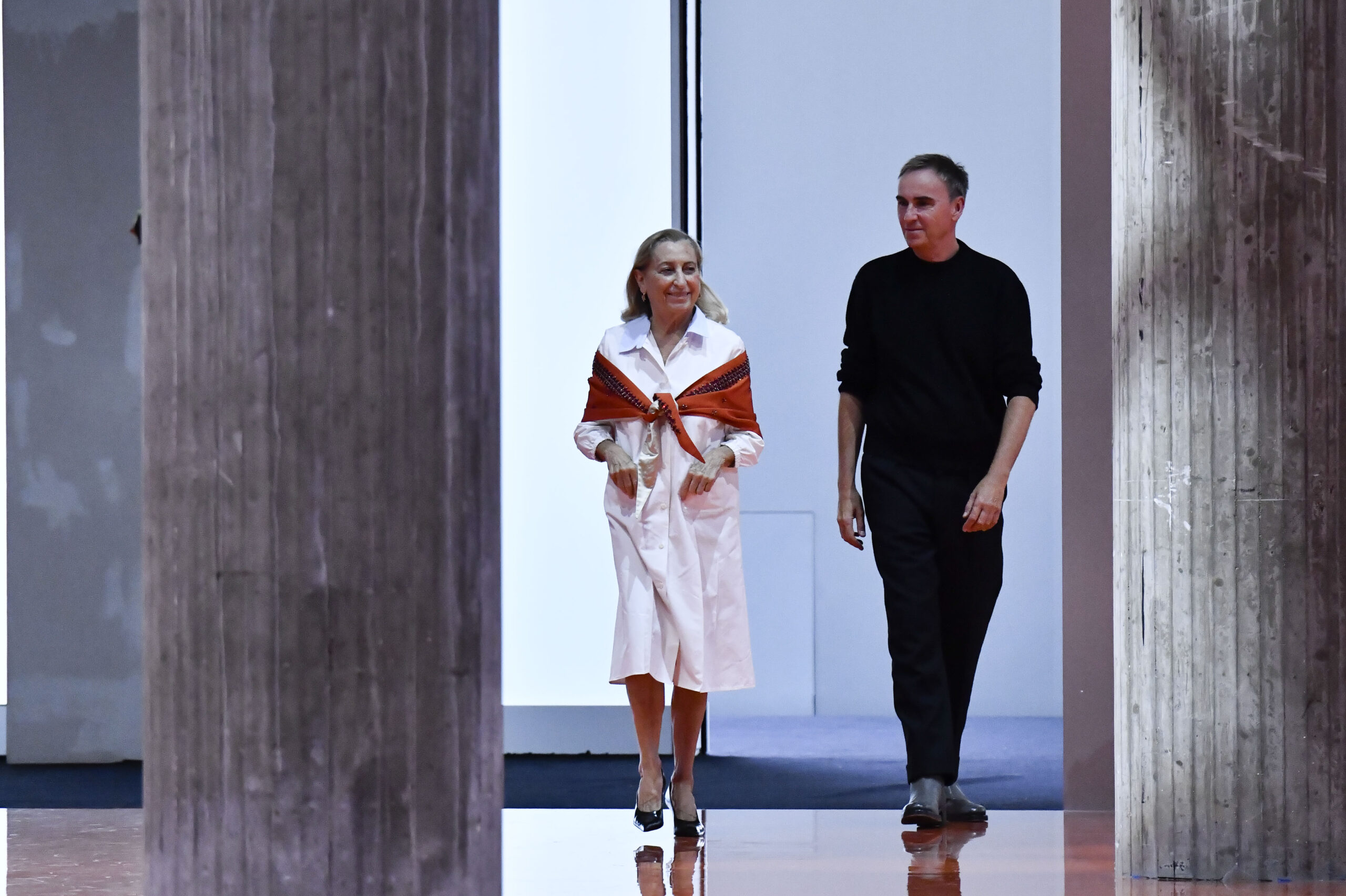 Το κοινό το κατάλαβε πρώτη φορά στο τέλος της επίδειξης Prada Άνοιξη–Καλοκαίρι 2026. Η Miuccia βγήκε στη σκηνή με τον Raf Simons, φορώντας ένα μεγάλο, τριγωνικό φουλάρι που φώτιζε το outfit της. Δεν ήταν ένα στυλιστικό τυχαίο. Ήταν statement.