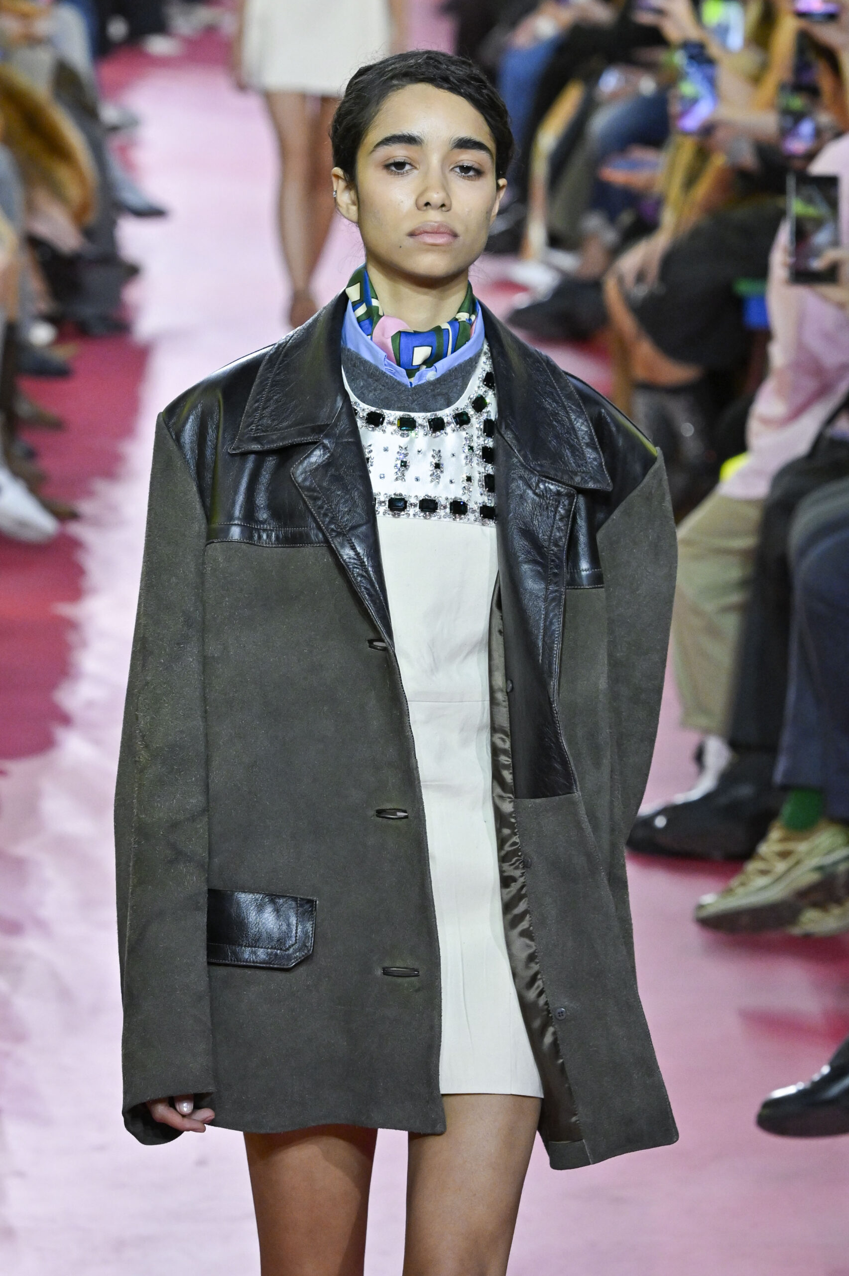 Λίγες μέρες αργότερα, στο Παρίσι για το show της Miu Miu, εμφανίστηκε με νέα εκδοχή του φουλαριού που συνόδευε όλα σχεδόν τα runway σύνολα. Και η επιβεβαίωση ήρθε στη Ντόχα, στα βραβεία Fashion Trust Arabia 2025, όπου φόρεσε ένα εξατομικευμένο, κεντητό τριγωνικό κομμάτι, φτιαγμένο από υφάσματα της συλλογής Miu Miu SS 2026. Έκλεψε την παράσταση – και ουσιαστικά “κλείδωσε” την τάση.