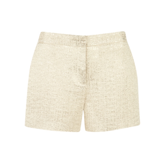 Metallic σορτς σε ψηλόμεση γραμμή. Φόρεσέ το με ένα σιέλ πουκάμισο και nude πέδιλα. Κάνε πιο εντυπωσιακό το σύνολό σου με ένα floral clutch σε ουδέτερα χρώματα.