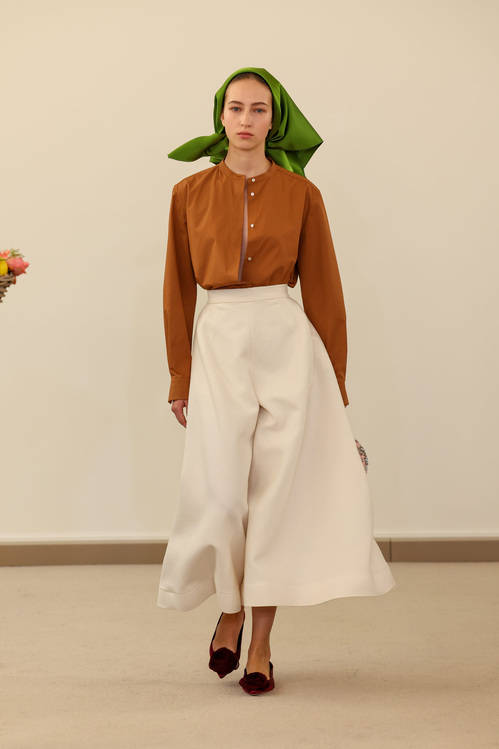 Αντίθετα, ο Giambattista Valli επέλεξε την υπερβολή και τον ρομαντισμό. Οι oversized μεταξωτές μαντίλες του, σε αποχρώσεις πολύτιμων λίθων, έφεραν μια αίσθηση πολυτέλειας και νοσταλγίας, θυμίζοντας κινηματογραφικές ηρωίδες άλλων εποχών.