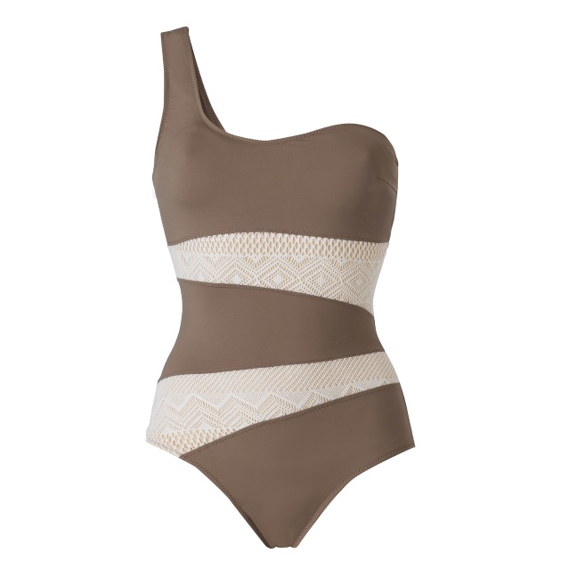 Ολόσωμο μαγιό σε γήινες αποχρώσεις. Οι δαντελένιες γραμμές θα κολακεύσουν τις καμπύλες σου.