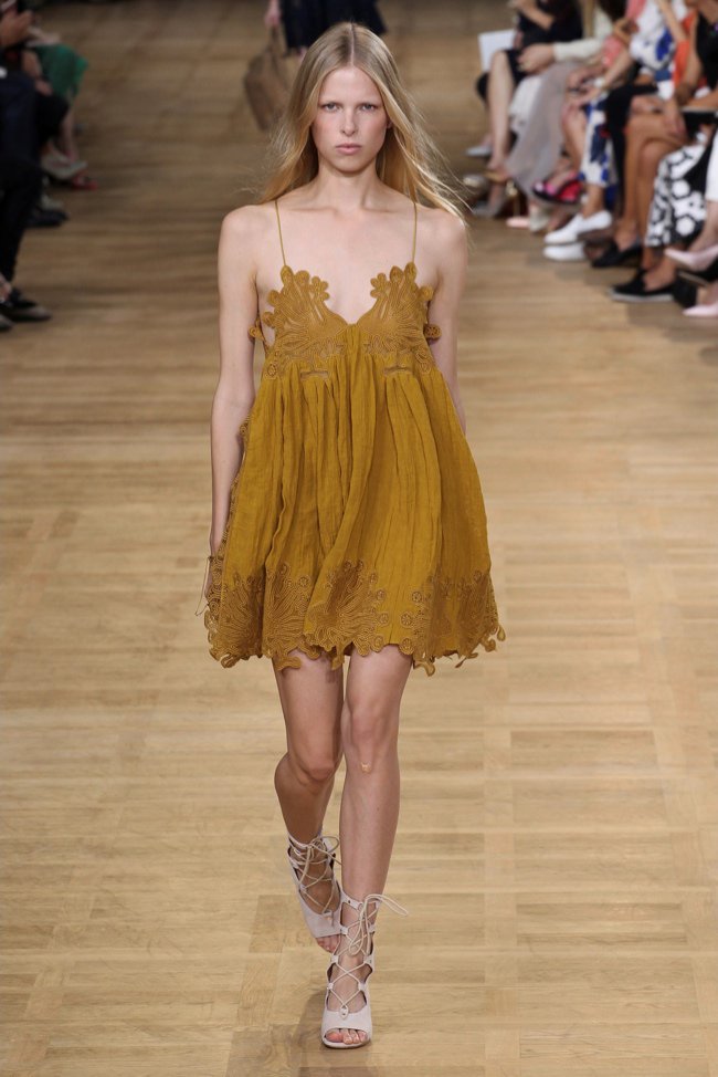 Το απαλό, χαλαρό attitude της γυναίκας Chloe απέκτησε bohemian chic και folklore επιρροές. Η καλλιτεχνική διευθύντρια του οίκου, Clare Waight Keller διατήρησε τις εύκολες, και καθαρές γραμμές του σε ένα χρωματικό μείγμα από παστέλ χρώματα, navy blue και μουσταρδί ενώ δεν έλλειψαν και τα denim looks.