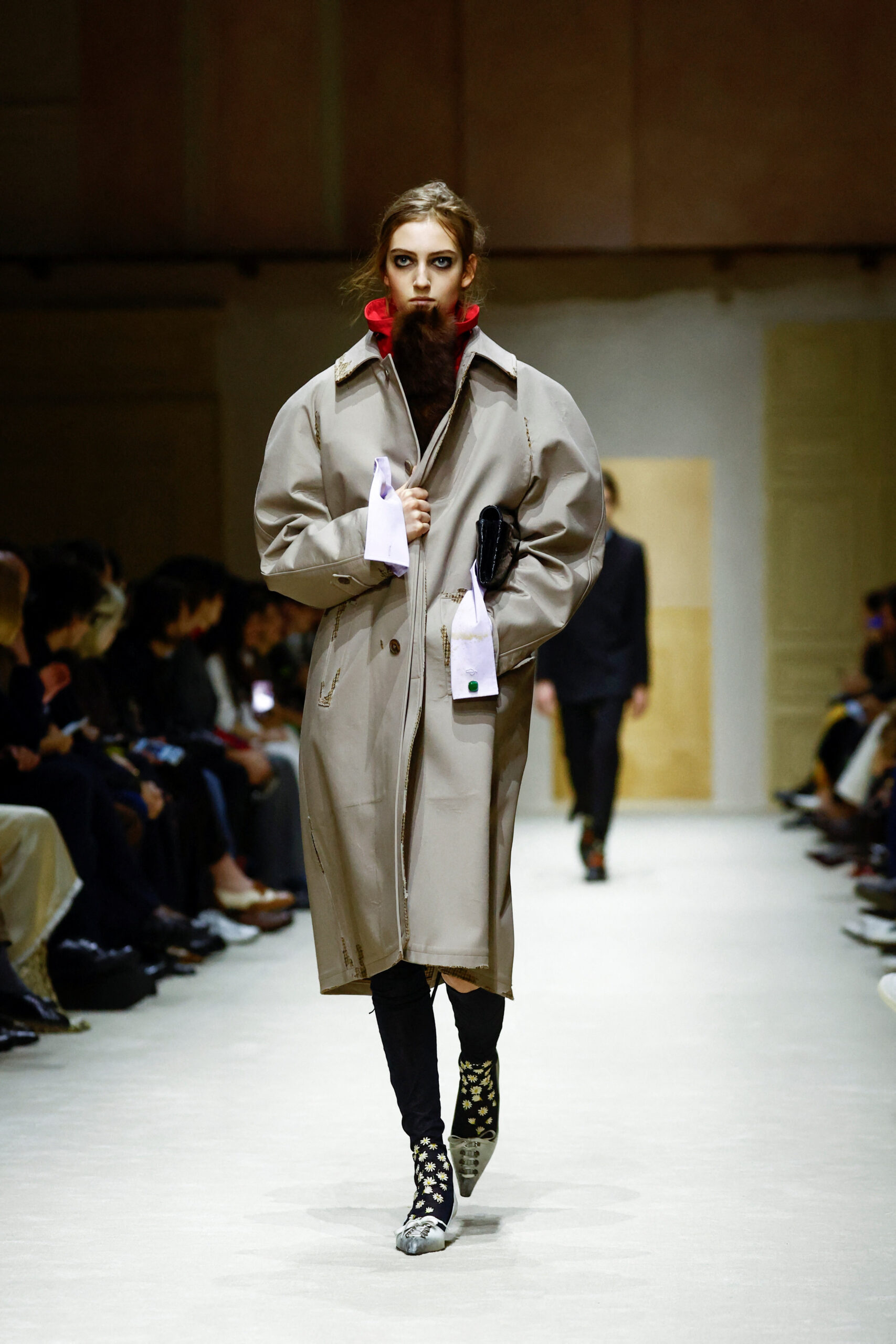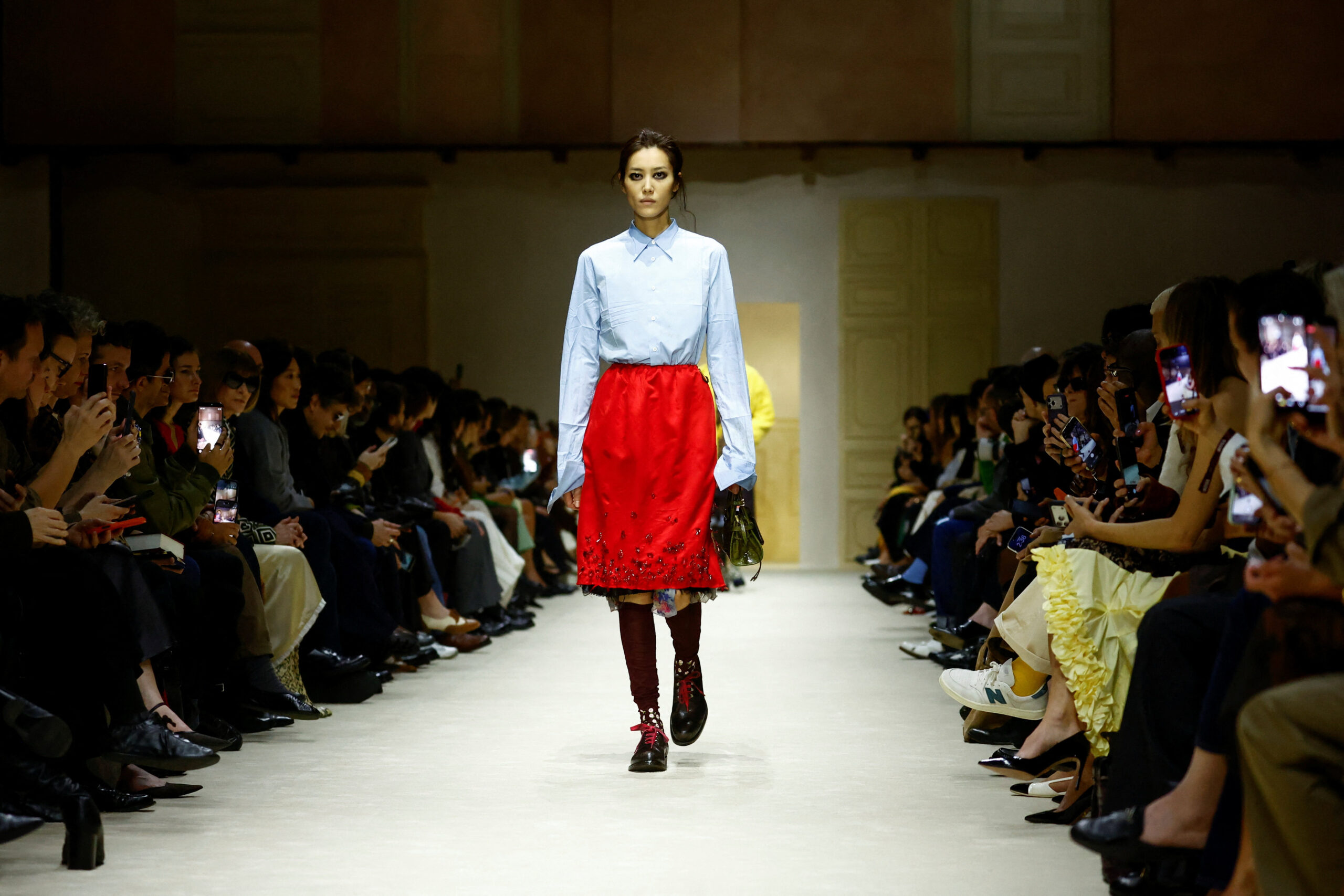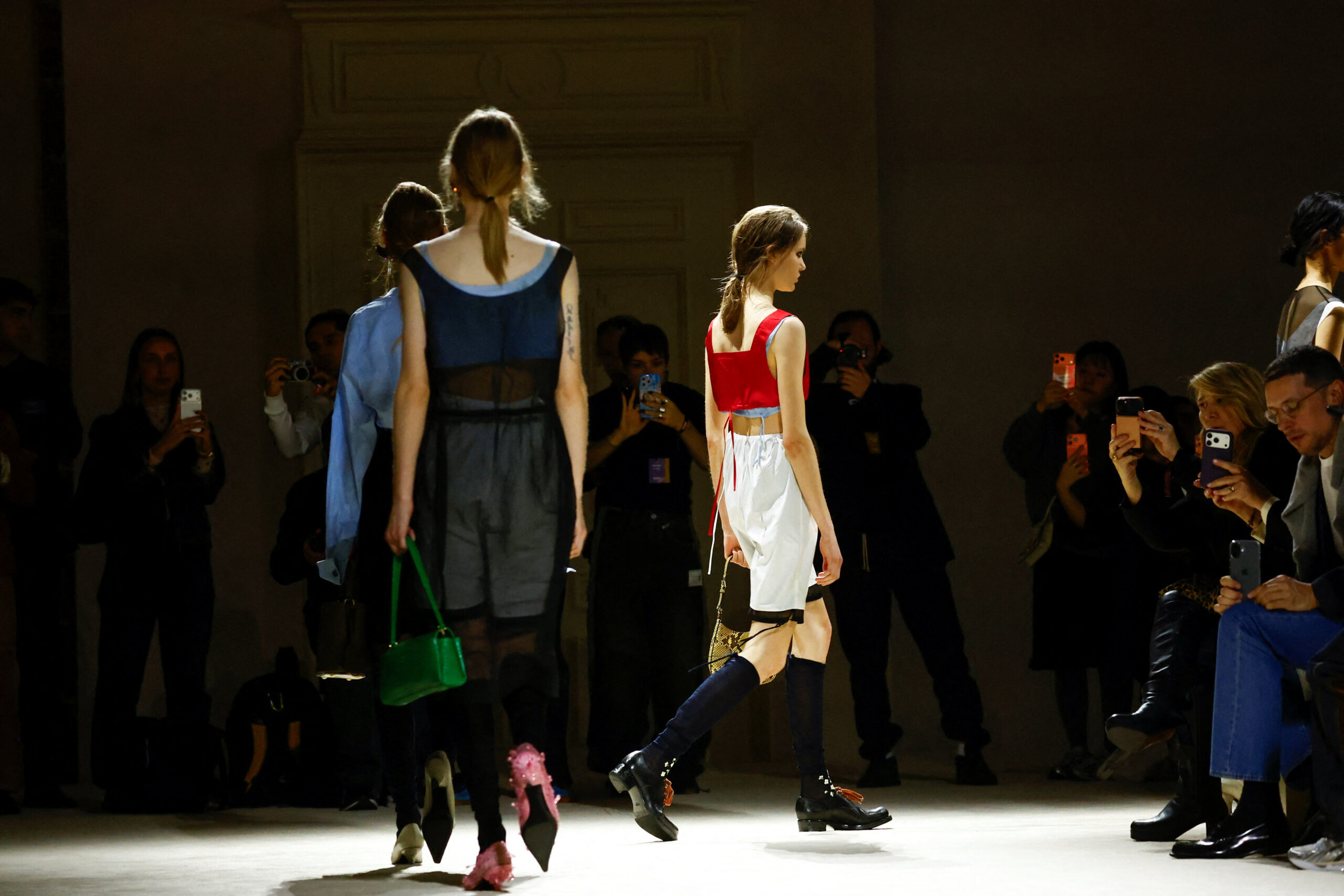 Στην πασαρέλα, μόλις 15 μοντέλα παρουσίασαν μια ισχυρή ιδέα: κάθε look μεταμορφωνόταν σταδιακά μέσα από τρεις έως τέσσερις εκδοχές. Το ίδιο σύνολο αποκτούσε νέα διάσταση με την προσθήκη μιας διαφανούς φούστας, ενός πλεκτού top, ενός structured παλτό ή ενός ζευγαριού kitten heels.