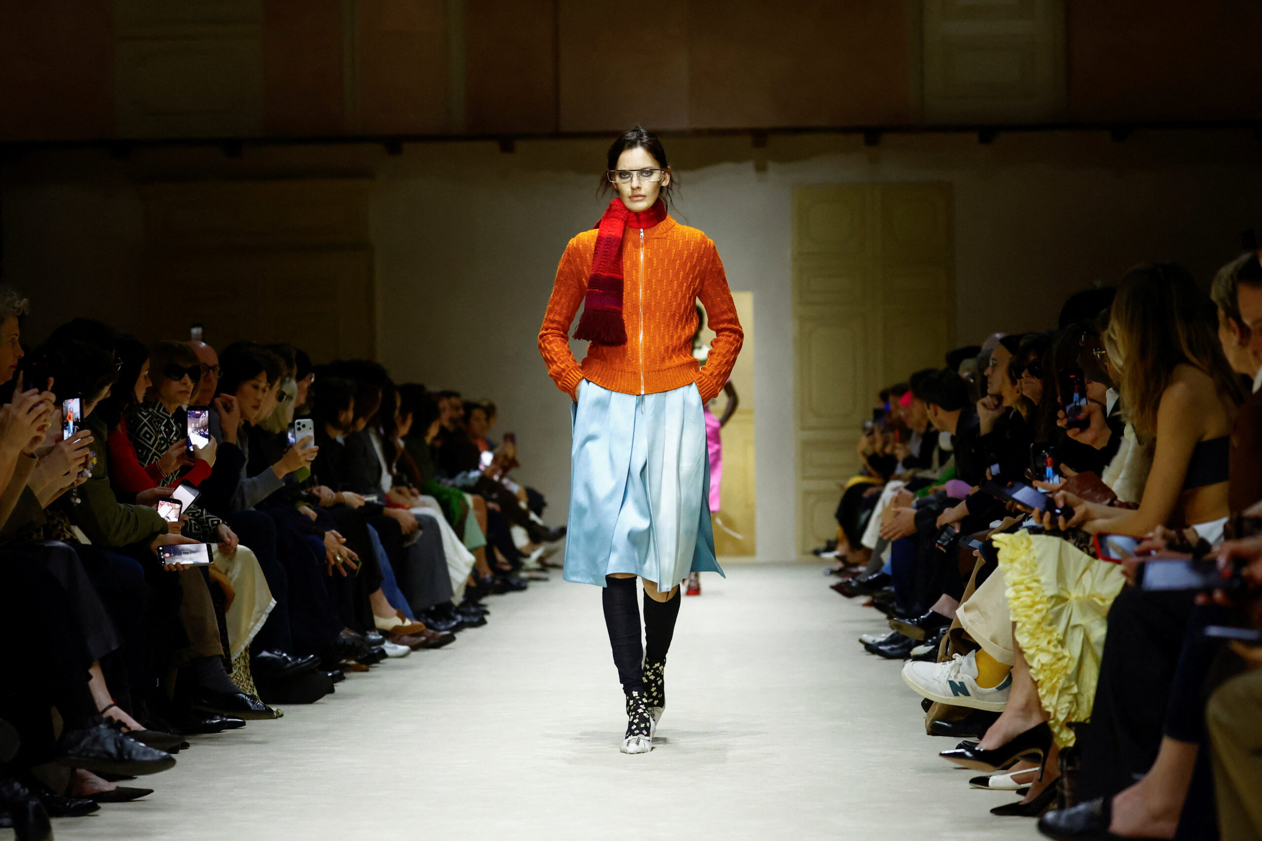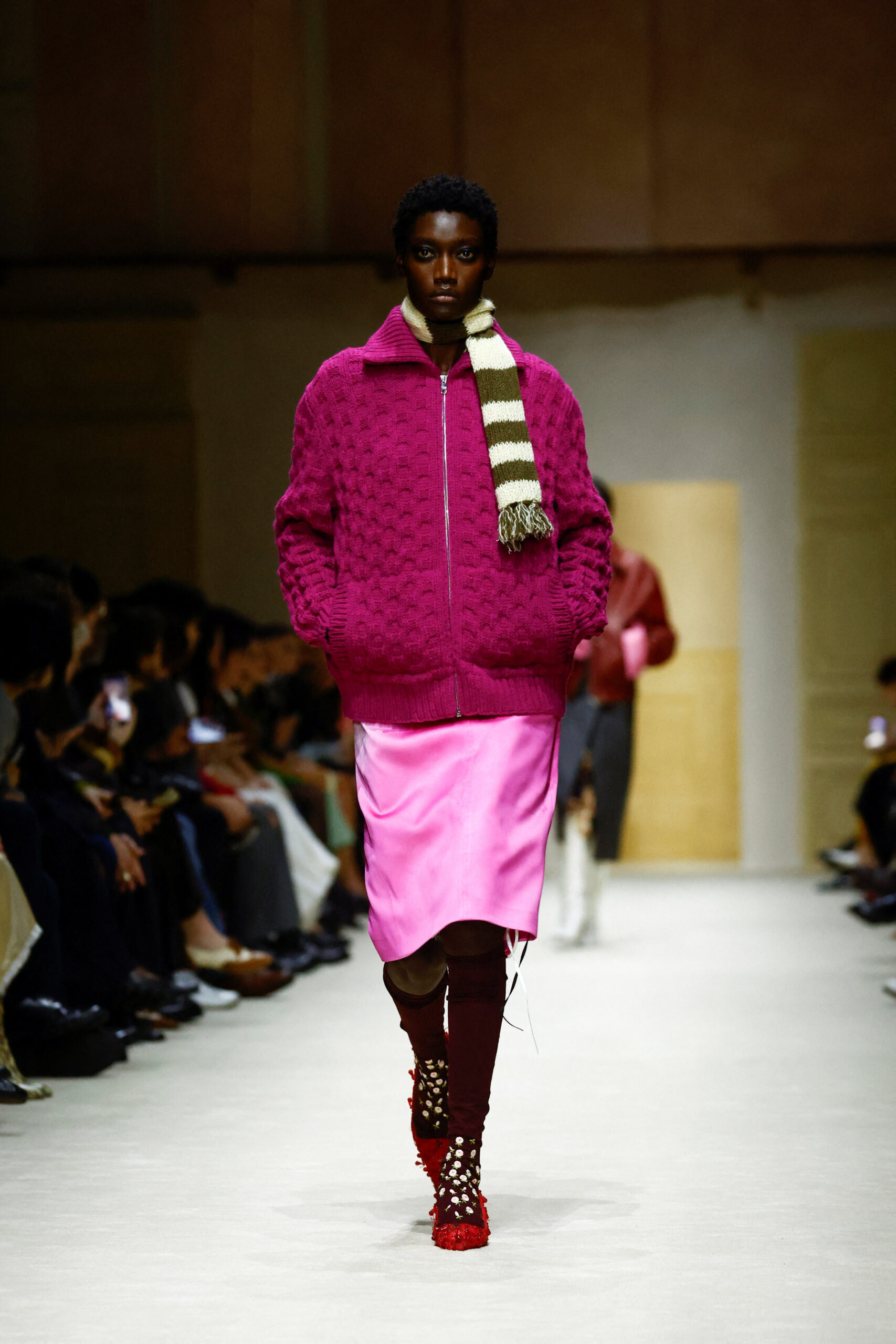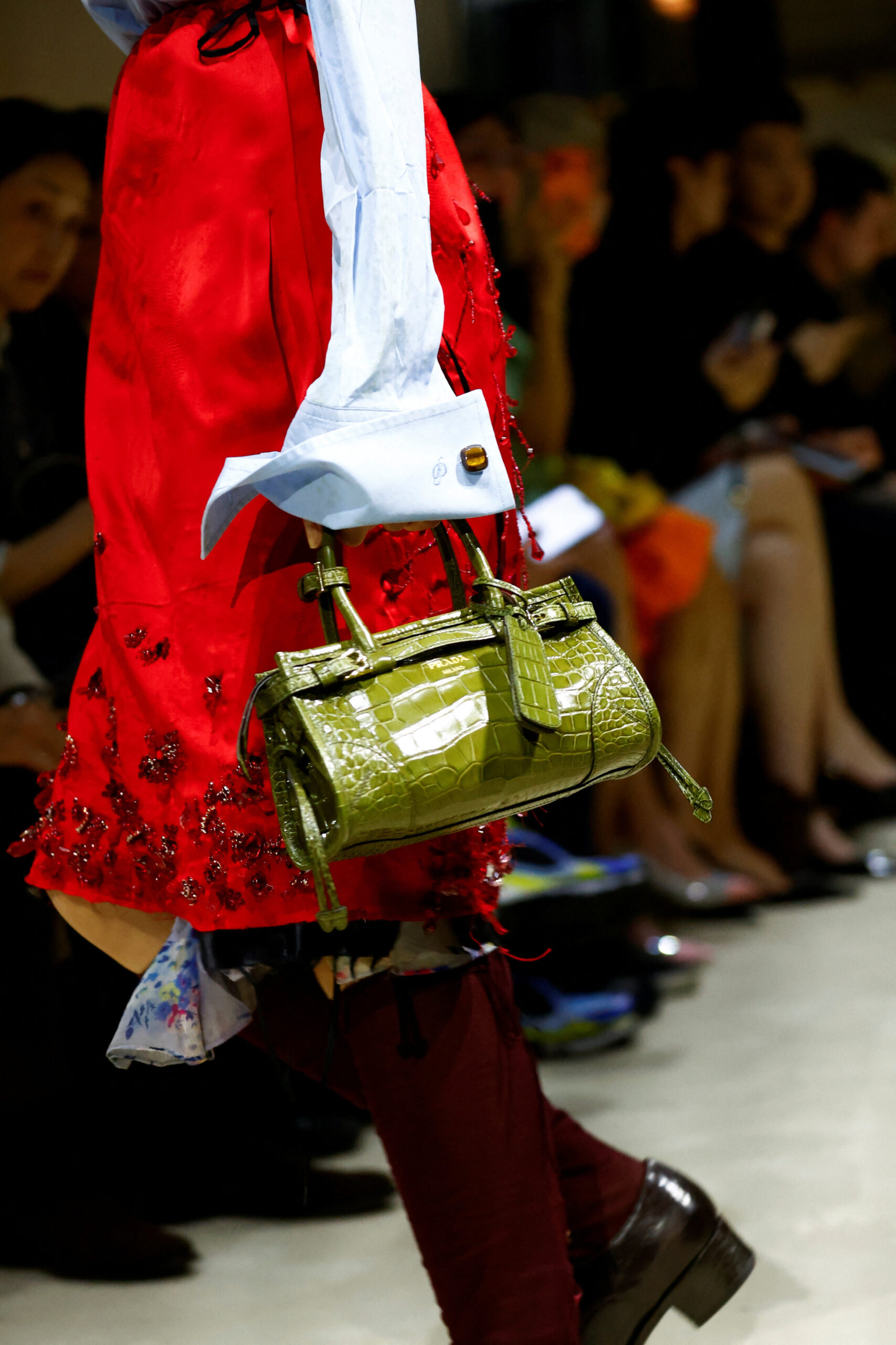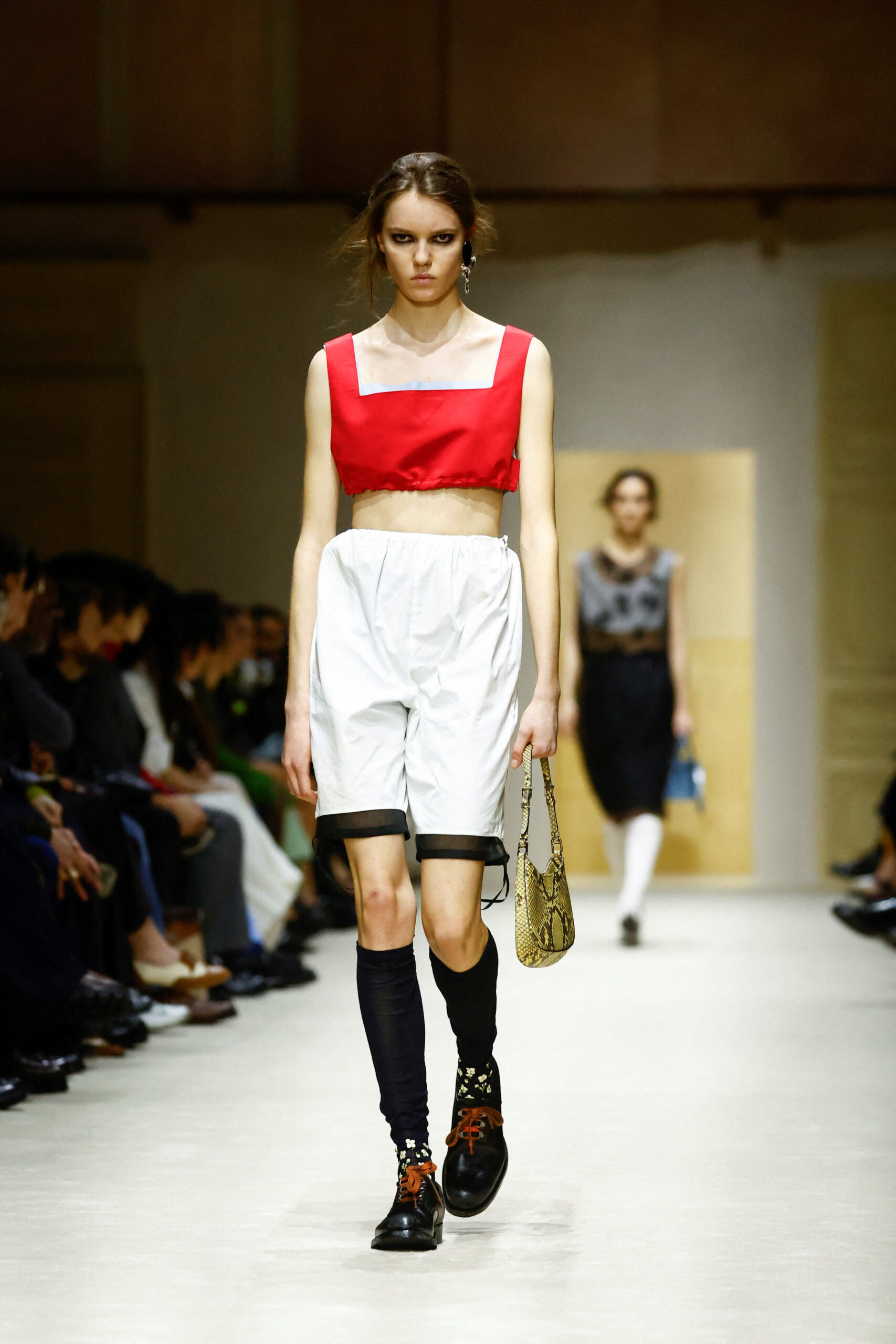 Τα looks ξεκινούσαν πιο καθαρά και φωτεινά, με βασικά κομμάτια που έδιναν έμφαση στην πρακτικότητα. Σταδιακά, εμπλουτίζονταν με υφές, κεντήματα και διαφάνειες, αποκτώντας μεγαλύτερη ένταση και χαρακτήρα, μέχρι να καταλήξουν σε πιο εκφραστικές και elegant εκδοχές για το βράδυ. Στοιχεία όπως κάλτσες, πλεκτές μανσέτες, βερμούδες, embellished tops και έντονα χρώματα δημιουργούσαν μια boudoir αισθητική, αποδοσμένη όμως με τον απόλυτα σύγχρονο και πολυτελή τρόπο της Prada.