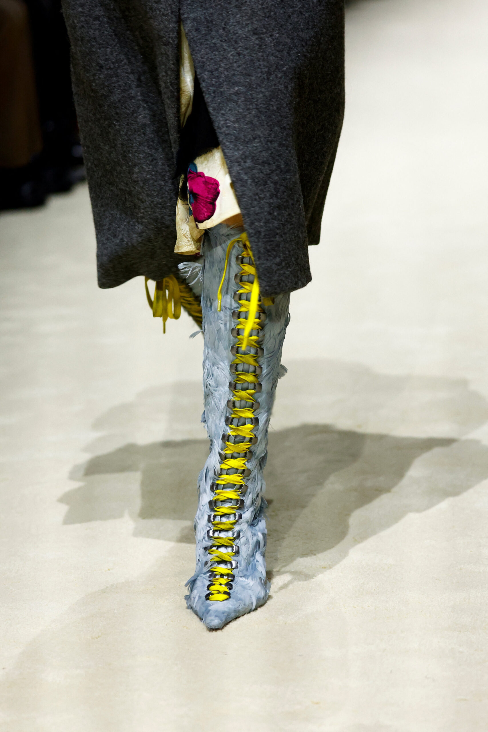 Το layering έγινε η βασική γλώσσα της συλλογής. Διαφάνειες συνδυάστηκαν με αυστηρές γραμμές, φούστες που έμοιαζαν με κόσμημα φορέθηκαν πάνω από βασικά κομμάτια, ενώ πρακτικά parkas και ανδρικά πουκάμισα «διέκοπταν» τη θηλυκότητα με έναν σύγχρονο, σχεδόν διανοητικό τρόπο. Η τεχνητή γούνα, το γυαλιστερό δέρμα και το χαρακτηριστικό νάιλον της Prada συνυπήρχαν σε μια ισορροπία αντιθέσεων: προστασία και ευθραυστότητα, αυστηρότητα και ρομαντισμός, λειτουργικότητα και συναίσθημα.