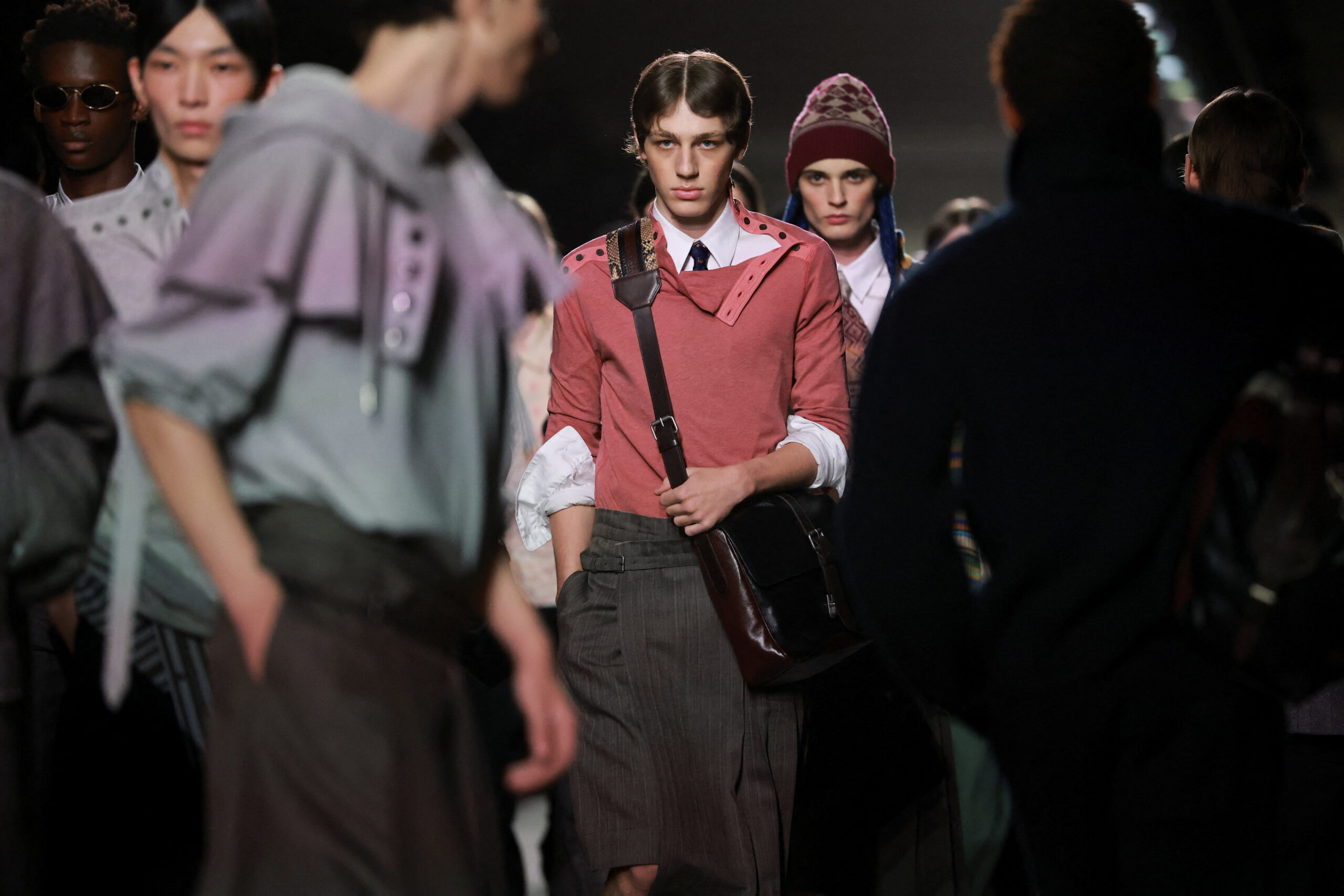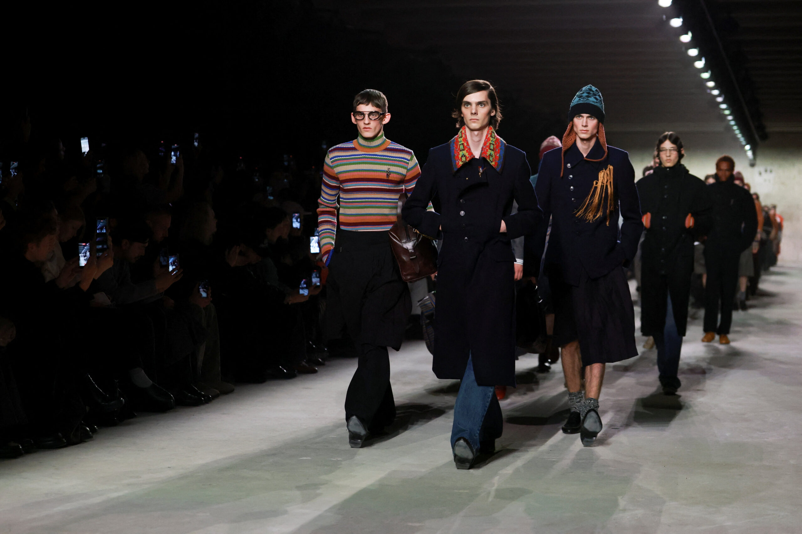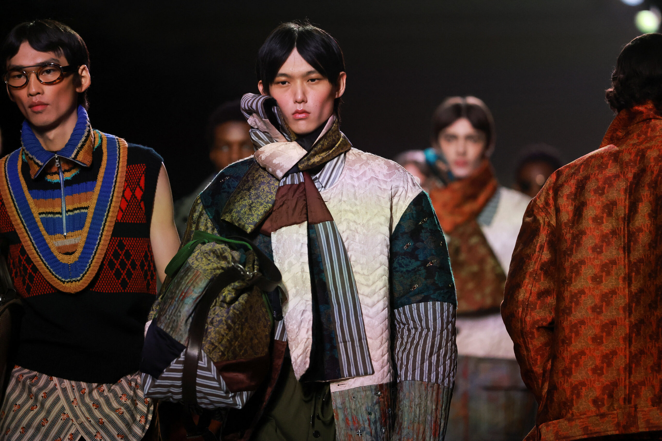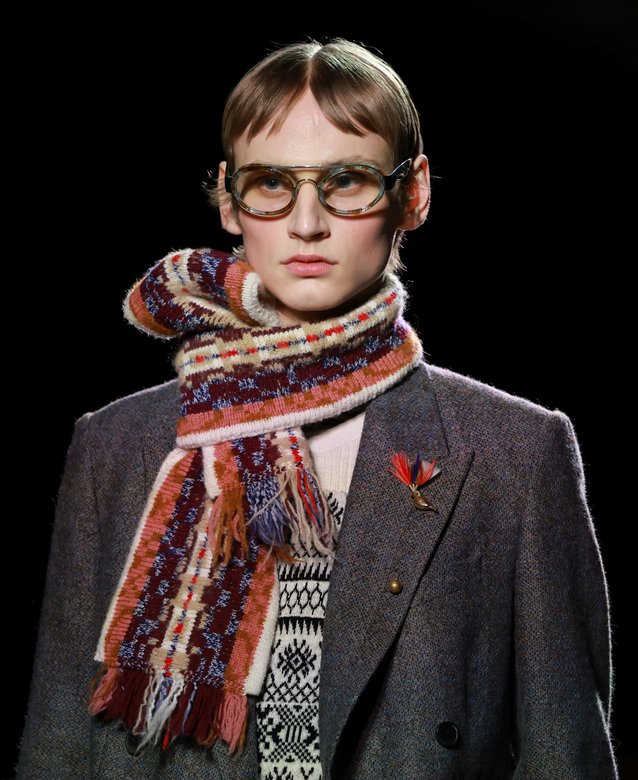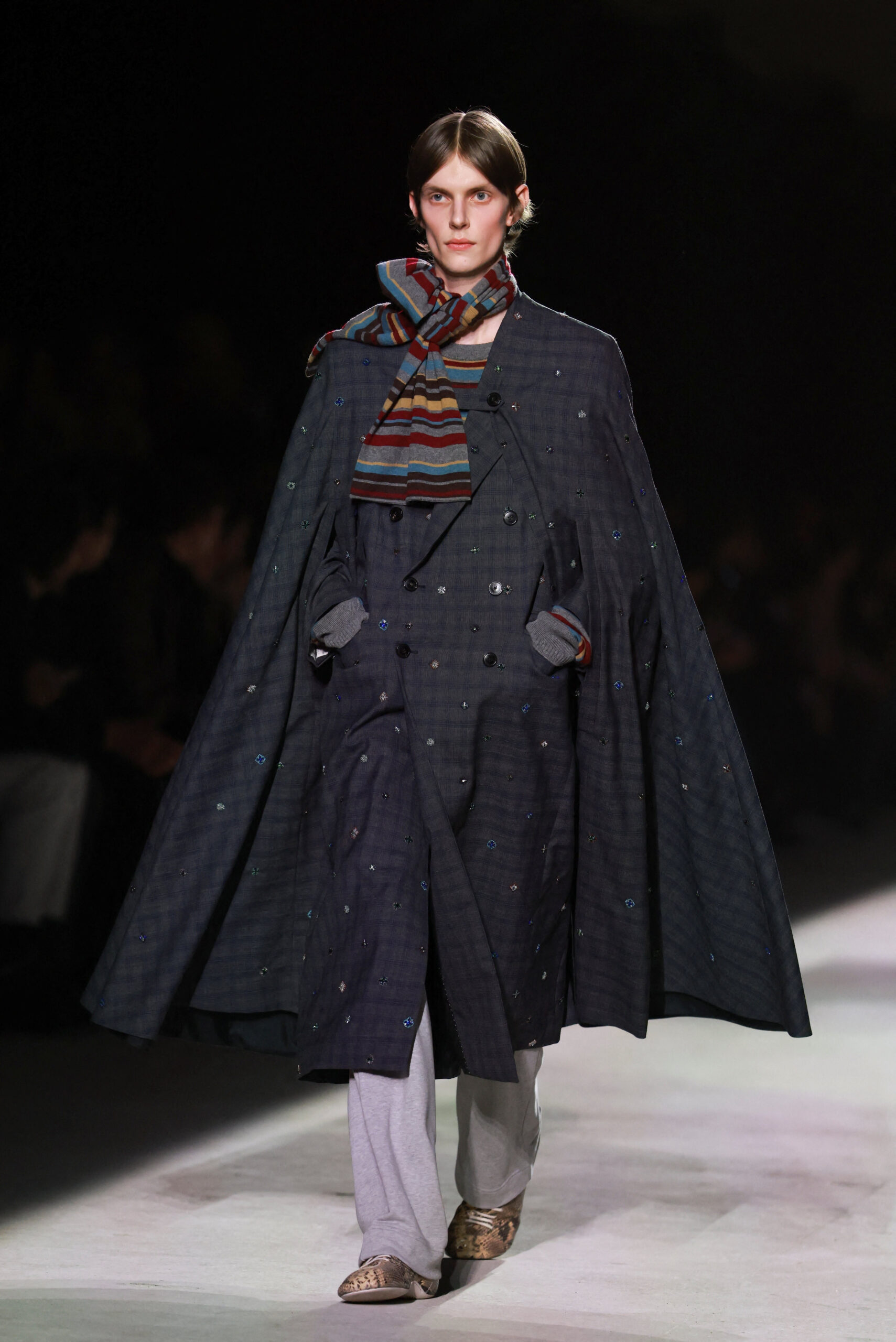 Η συλλογή του Klausner που είδαμε χθες βράδυ στο Παρίσι, βασίζεται σε ατσάλινα, δομημένα πανωφόρια, από παλτό μέχρι καμπαρντίνες που φοριούνται όλη μέρα, εμπλουτισμένα με διακριτικές πινελιές δέρματος. Ωστόσο, το πραγματικό μήνυμα του Dries δεν κρύβεται τόσο στις γραμμές όσο στις λεπτομέρειες. Παλιομοδίτικα πλεκτά συνδυάζονται με πλεκτά σκουφάκια, μεταξωτές γραβάτες και old skool γυαλιά μυωπίας! Μια ελαφριά δόση nerd style κάνει την εμφάνισή της δίνοντας στους πιο fashionable άντρες την ευκαιρία να εκφράσουν την ιδιαιτερότητά τους.