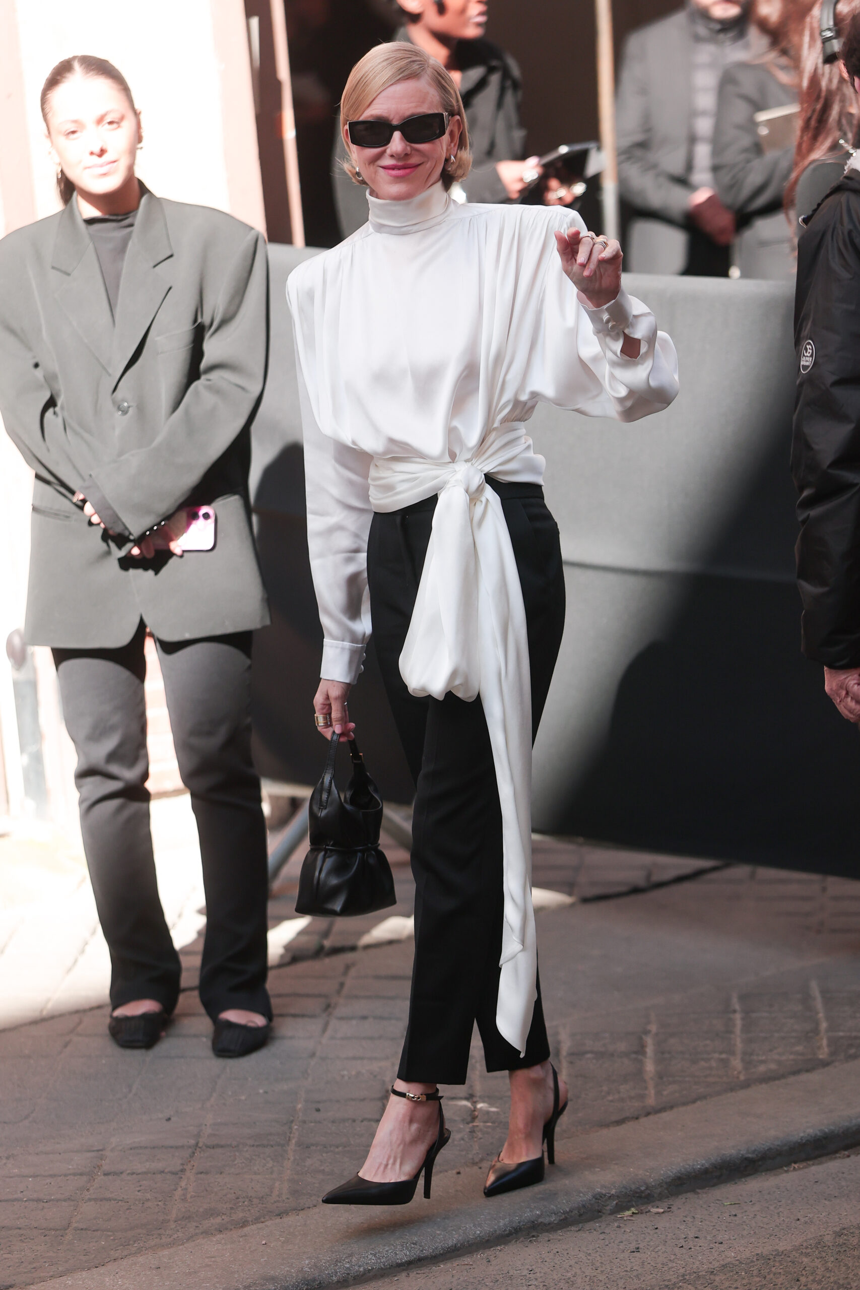 Από την άλλη, η Naomi Watts εμφανίστηκε με ένα λευκό σατέν πουκάμισο με πολύ έντονους ώμους, το οποίο τόνισε τη μέση της με μια ζώνη, δημιουργώντας μια σιλουέτα που παρέπεμπε στα iconic power looks των 80s.